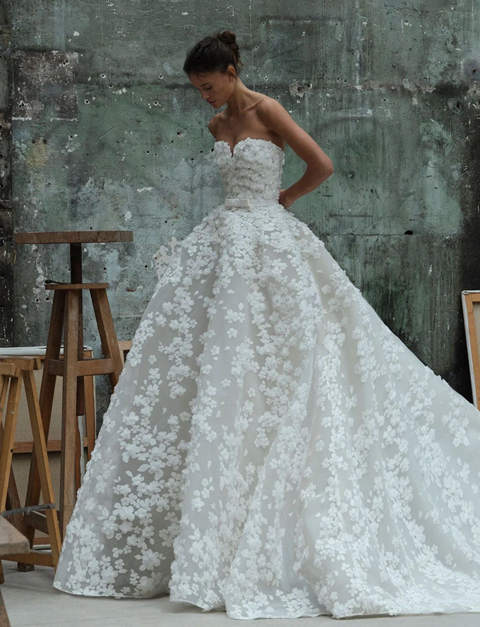 3D 플라워 패턴과 오간자 소재의 플로럴 아플리케가 겹겹이 쌓인 드레스는 형태와 질감, 꽃의 움직임이 하나로 어우러지는 브라이덜 꾸띄르 드레스의 정수로 우아하고 고급스러운 신민아의 취향을 더욱 돋보이게 했다. 풍성한 볼륨과 트레인, 흔들리는 꽃잎, 깔끔한 베일이 조화를 이루며 클래식하지만 현대적인 감각을 동시에 담아냈다.
