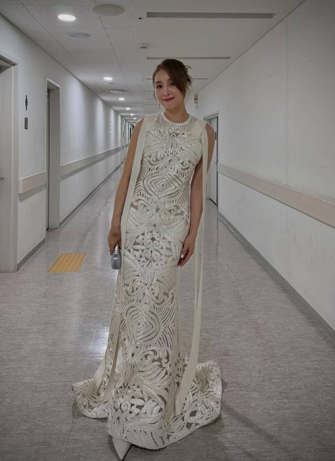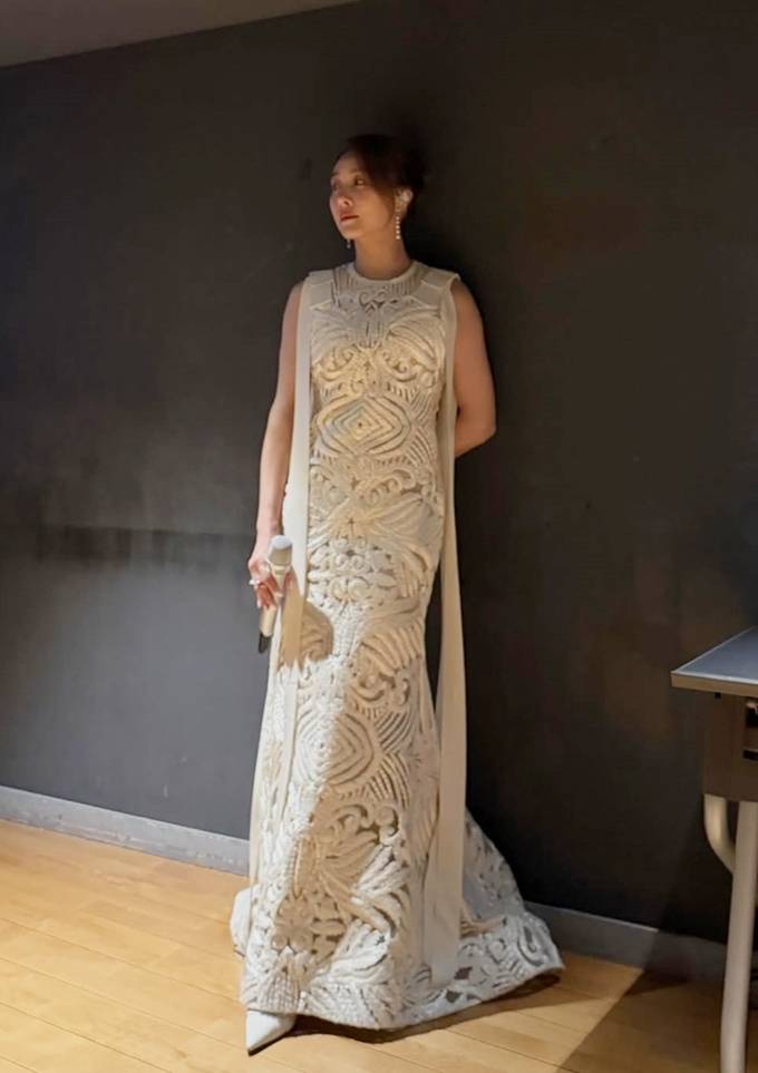 공개한 사진에서 옥주현은 정교한 패턴과 구조적인 라인이 돋보이는 화이트 롱 머메이드 드레스룩으로 우아한 분위기를 드러냈다.