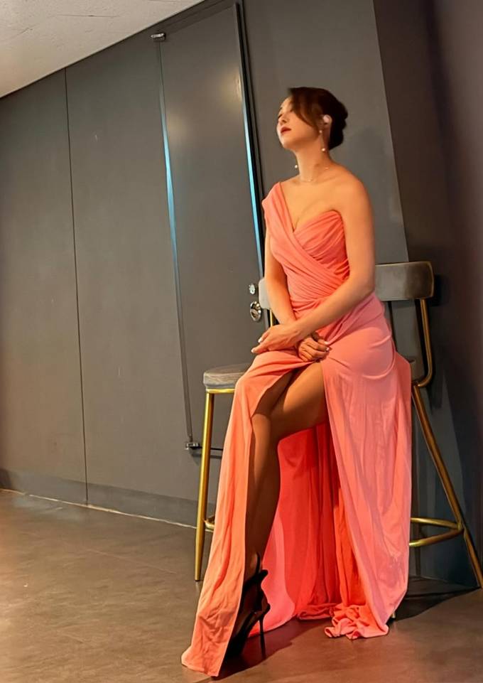 또 탄탄한 몸매가 돋보이는 부드러운 드레이핑과 깊게 트인 슬릿 디테일의 코랄 핑크 하이슬릿 원숄더 드레스룩으로 관능적이면서도 우아한 무드를 자아냈다.