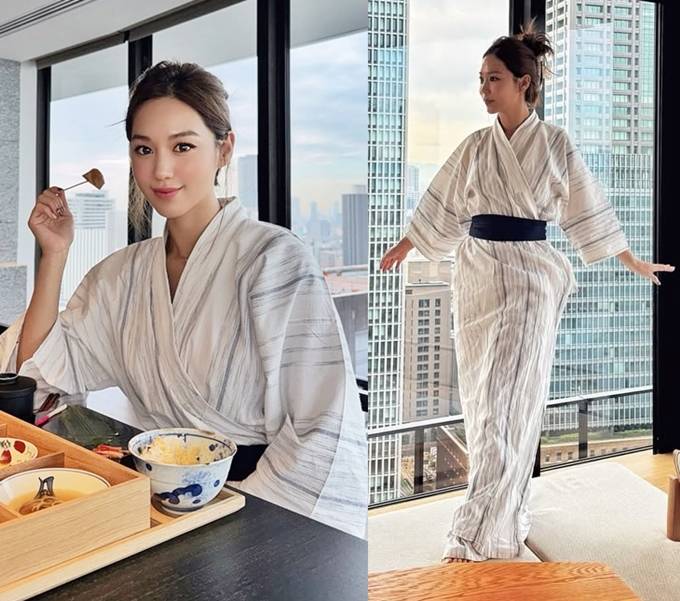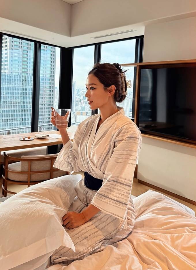 공개한 사진에서 김희정은 올려묶은 헤어 스타일에 블랙 벨트로 허리 라인을 강조한 스트라이프 화이트 홈 가운 호캉스룩으로 오사카 호텔에서 여유로운 시간을 갖는 모습을 드러냈다.