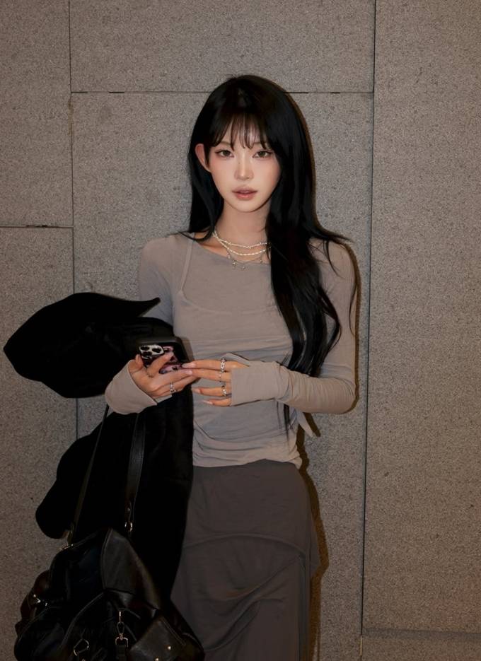 공개한 사진에서 최진희는 가녀린 실루엣이 드러난 그레이 롱 스커트와 톱을 착용한 톤온톤 스타일로 소녀 같은 동안 미모를 드러냈다.
