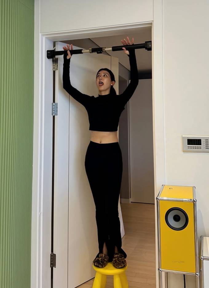공개한 사진에서 탄탄한 몸매가 드러난 블랙 레깅스와 크롭톱의 홈 트레이닝룩으로 문틀 철봉에 나서는 모습을 드러냈다.
