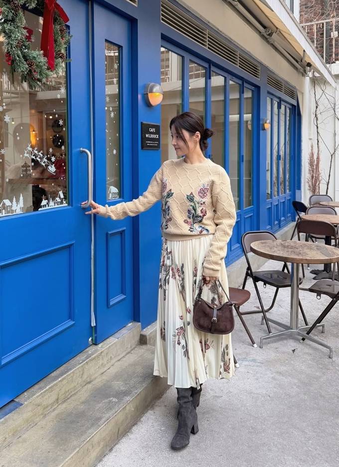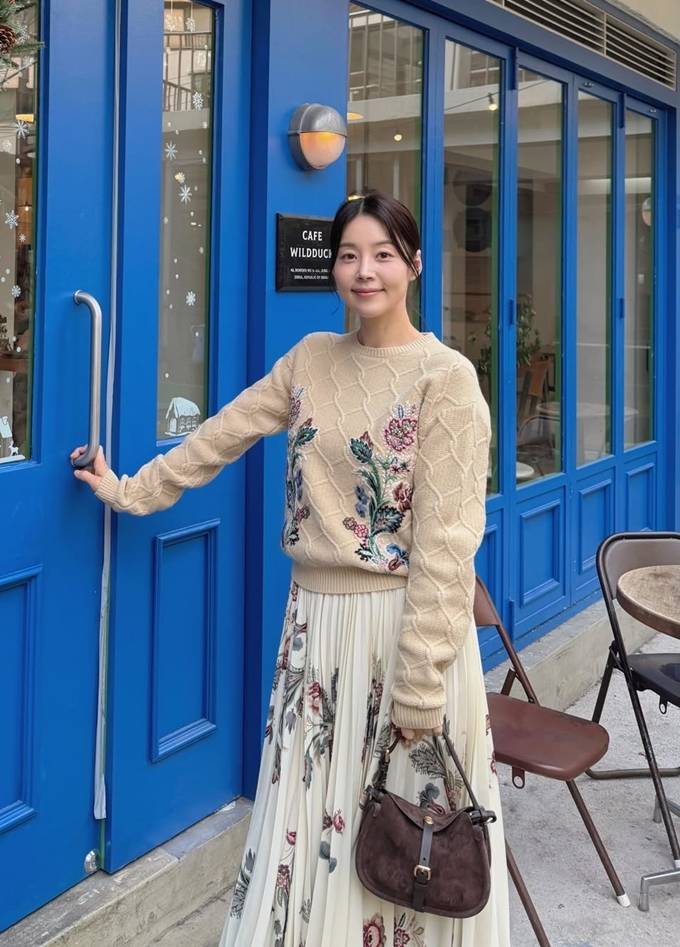 한지혜, 4살 딸 엄마의 러블리! 꽃무늬 니트와 플리츠 스커트 러블리 윈터 데일리룩
