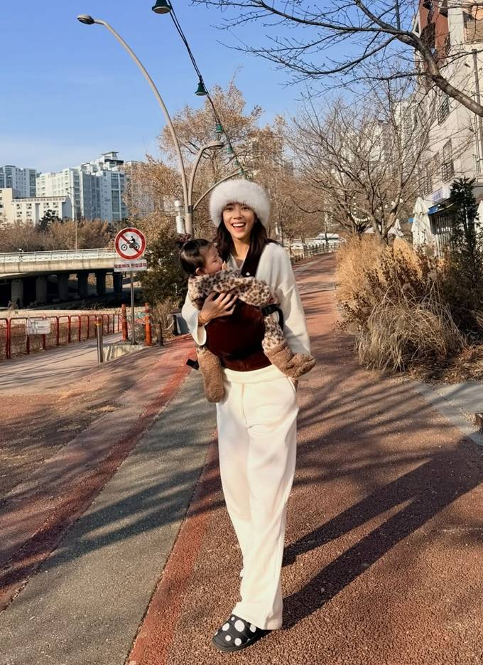 또한 9개월된 딸 해이는 표범 무늬 우주복에 털 신발을 착용한 스타일로 엄마 커플 산책룩을 완성했다.