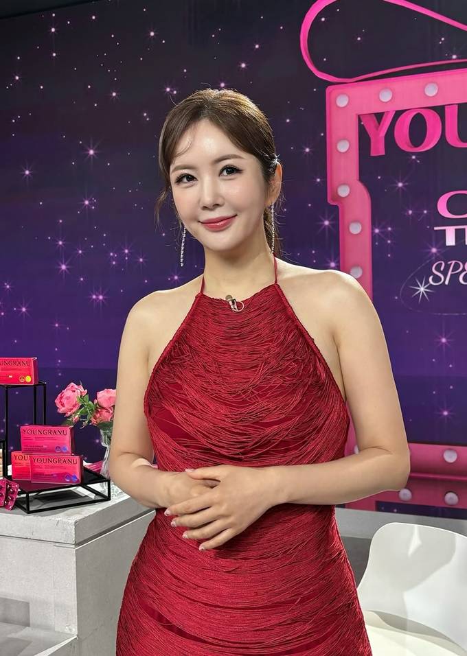 방송인 장영란이 실 그물 패턴의 강렬한 붉은색 홀터넥 드레스룩으로 점점 어려지는 동안 미모를 발산했다.