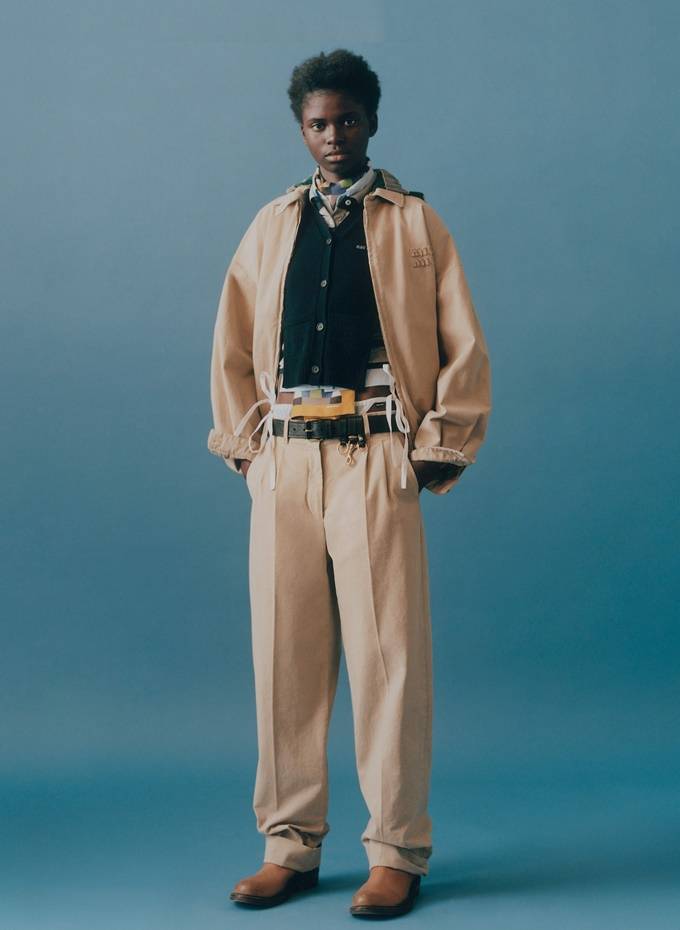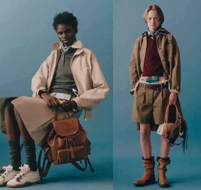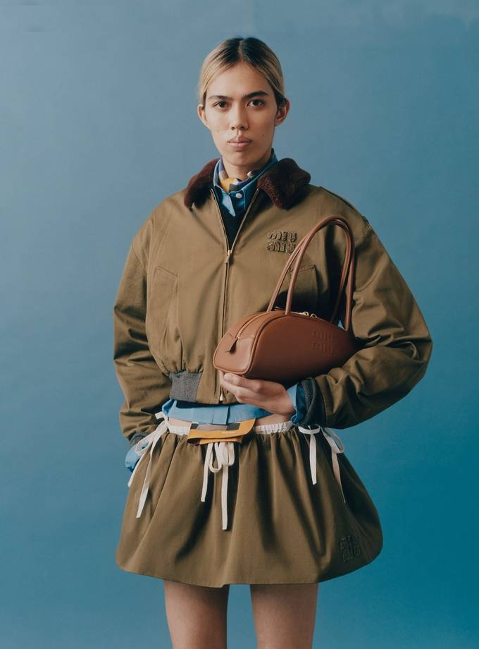 코튼 캔버스 로고 재킷, 풍성한 퍼프볼 마이크로 미니 스커트, 슬림핏 니트와 컬러풀한 폴로 셔츠 등 시그니처 아이템과 액서서리의 조합은 미우미우 특유의 레이어링 방식으로 표현했다.