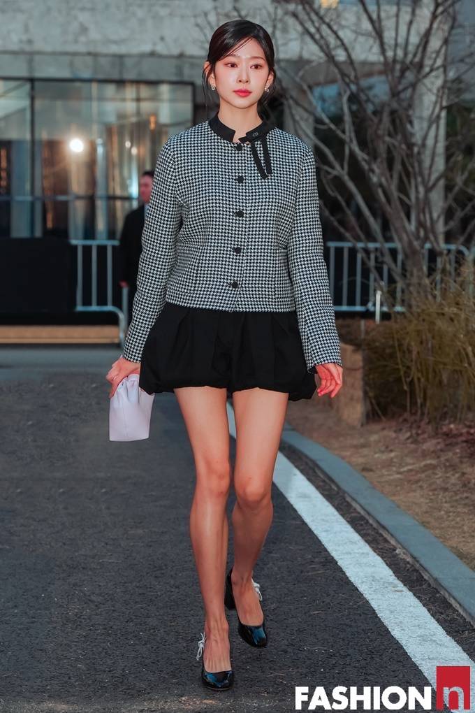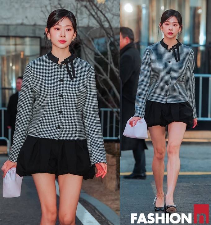 이날 김민주는 체크 재킷과 블랙 벌룬 스커트를 매치한 러블리한 투피스룩으로 각선미를 뽐냈다.