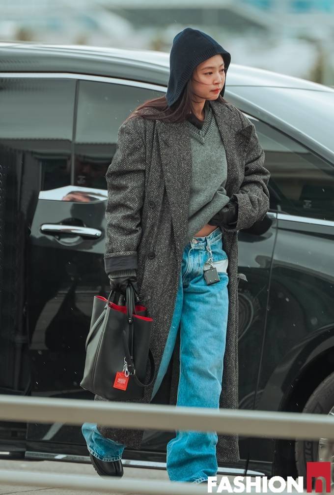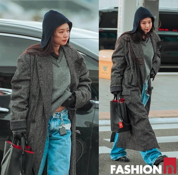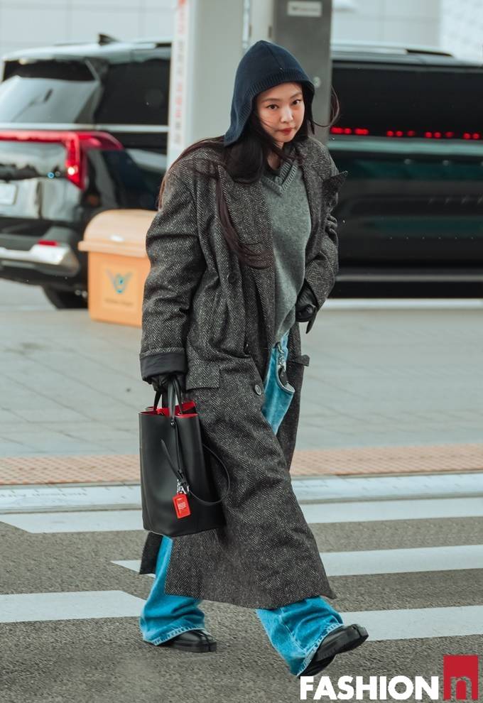 이날 제니는 헤링본 패턴의 맥시 코트 여기에 비니와 청바지를 더한 스타일리시한 겨울 데일리룩으로 패션센스를 발산했다.