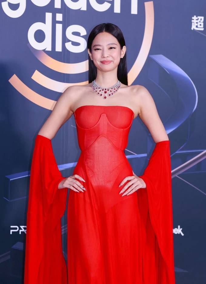 제니는 최근 엘르태국이 공식 SNS에 “모든 눈의 맞춤법! 오늘 대만에서 열린 제40회 골든디스크어워즈 레드카펫에서 주문제작한 레드 이브닝 가운을 이고 눈에 띄는 룩으로 등장한 제니”라는 글과 함께 공개한 사진에서 우아하면서도 강렬한 요정미를 드러냈다.