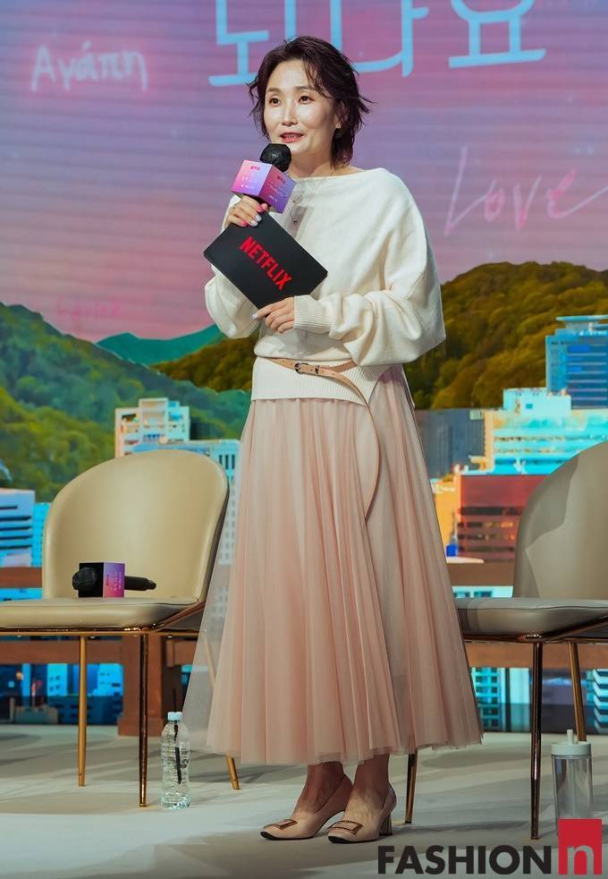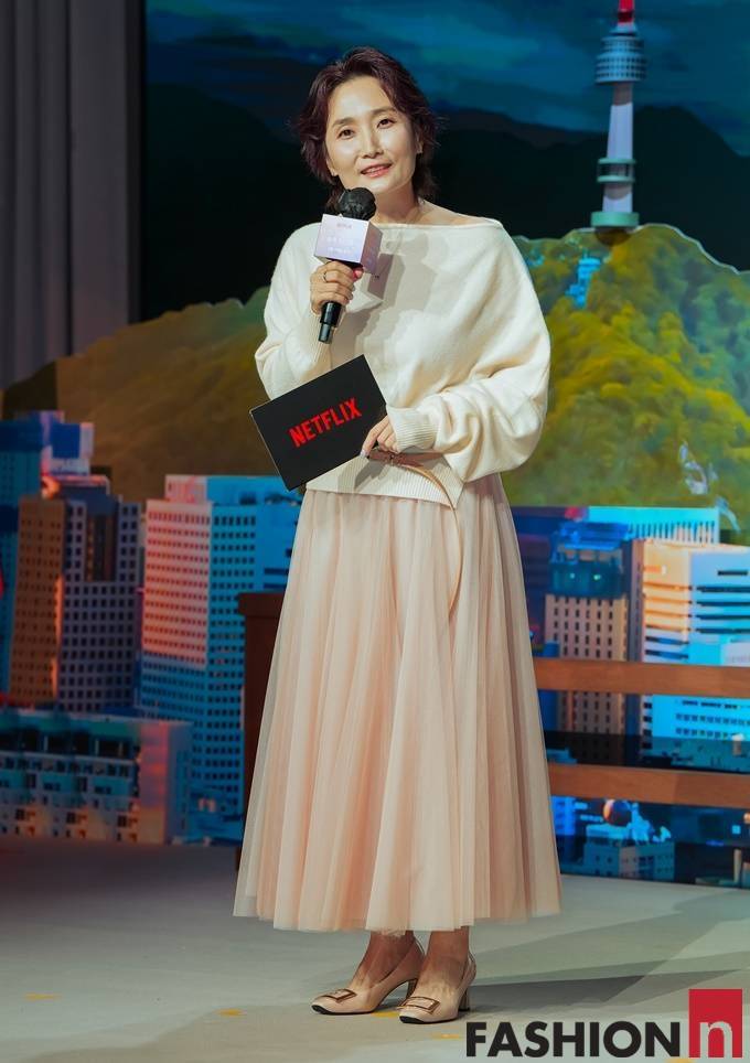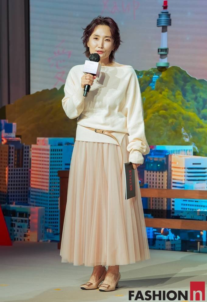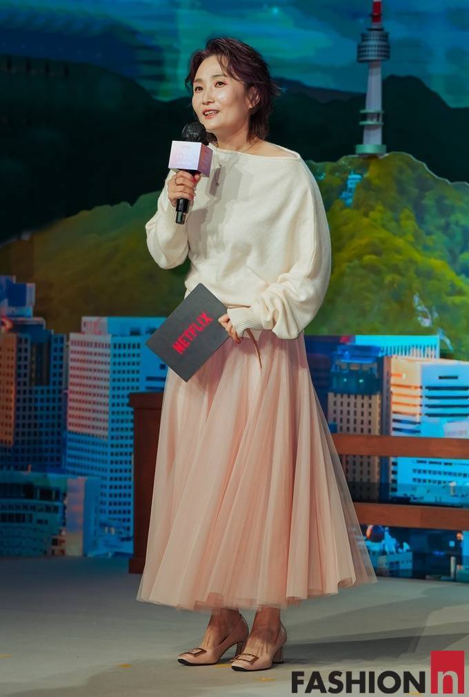 이날 박경림은 오버핏 티셔츠와 풍성한 샤 스커트가 눈에 띄는 우아한 발레코어룩으로 산뜻한 스타일을 연출했다.