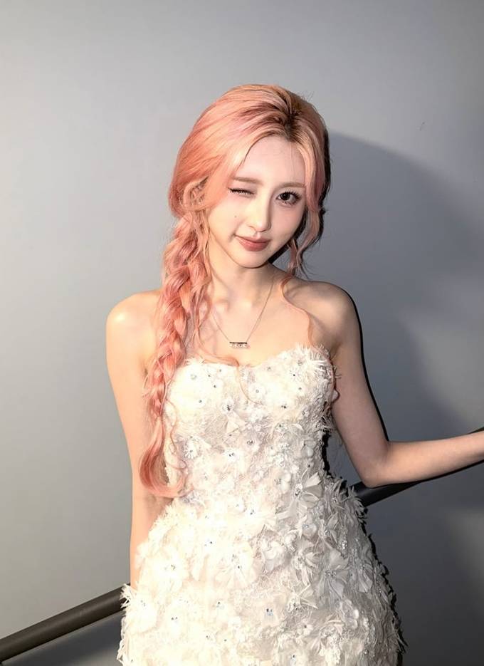 공개한 사진에서 가을은 연한 핑크빛 헤어를 길게 땋아 내린 스타일에 플라워 디테일이 풍성하게 장식된 요정 같은 실루엣의 화이트 튜브 톱 드레스룩으로 동화적인 분위기를 연출했다.