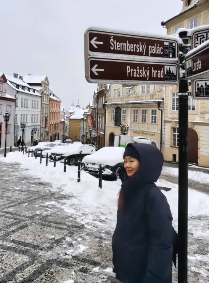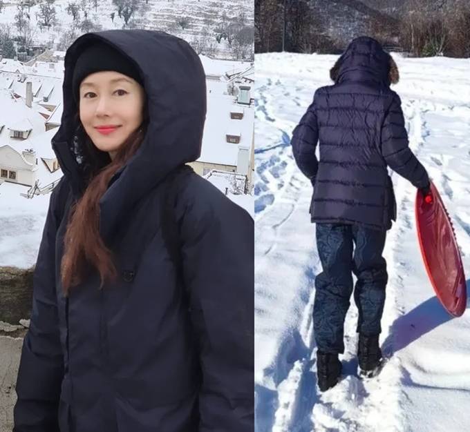 배우 김지수가 체코 프라하에서 후드 패딩룩으로 눈썰매를 즐겼다.