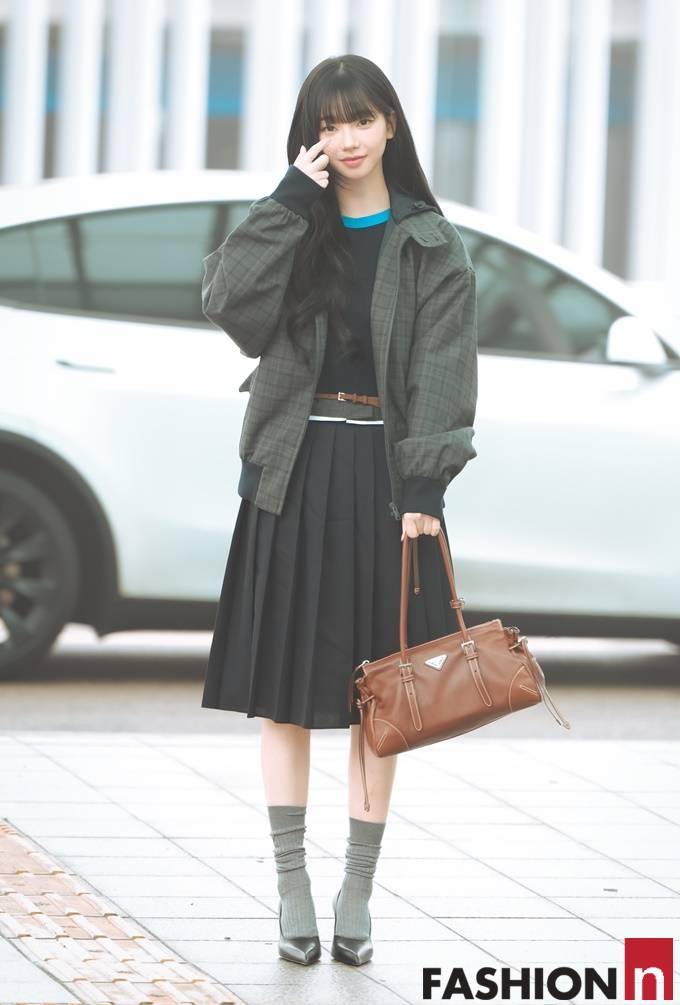 이날 카리나는 체크 무늬 봄버 재킷과 플리츠 스커트를 매치한 여성스러운 스쿨룩으로 화제를 모았다.