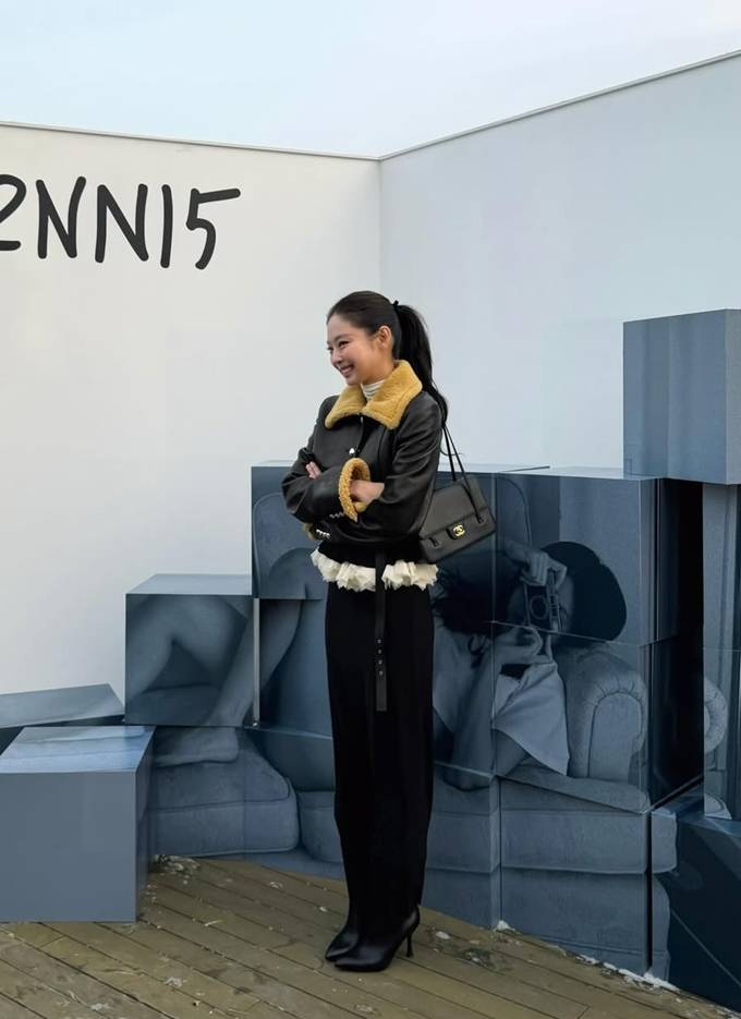현장을 찾은 제니는 하이넥 퍼 카라 벨트가 멋스러운 크롭 레더 재킷을 입고 럭셔리하면서도 세련된 전시회룩을 선보였다.