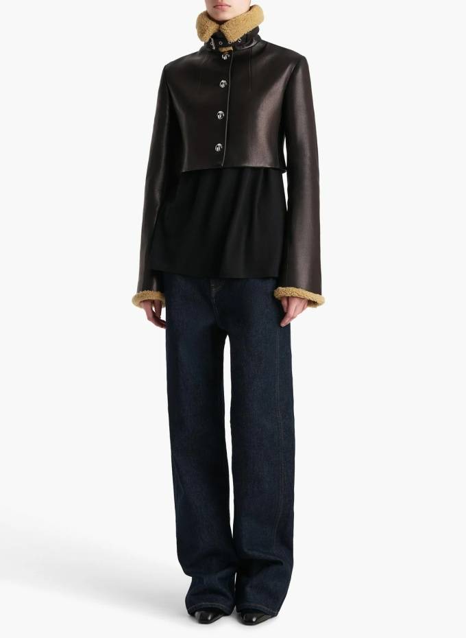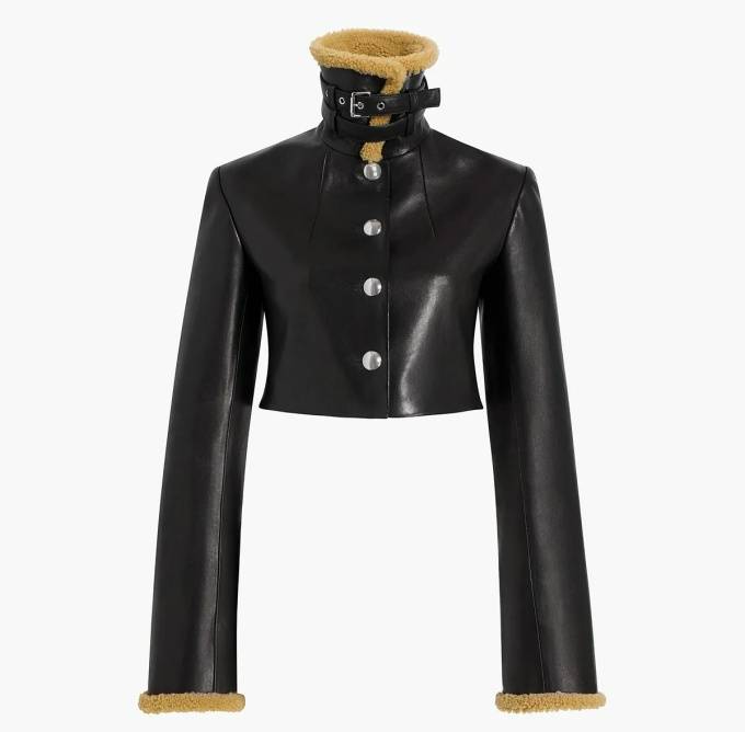 이 제품은 거칠고 세련된 디테일이 돋보이는 크롭 가죽 재킷으로 플루트가 있는 긴 소매에 벨트가 달린 스탠드 카라와 커프스의 시어링 소재가 특징이다.