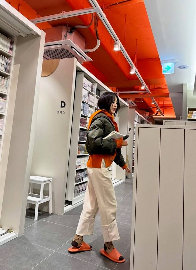 특히 오렌지 컬러의 니트 셋업에 슬리퍼까지 오렌지 컬러로 맞춰 감각적인 스타일을 완성했다.