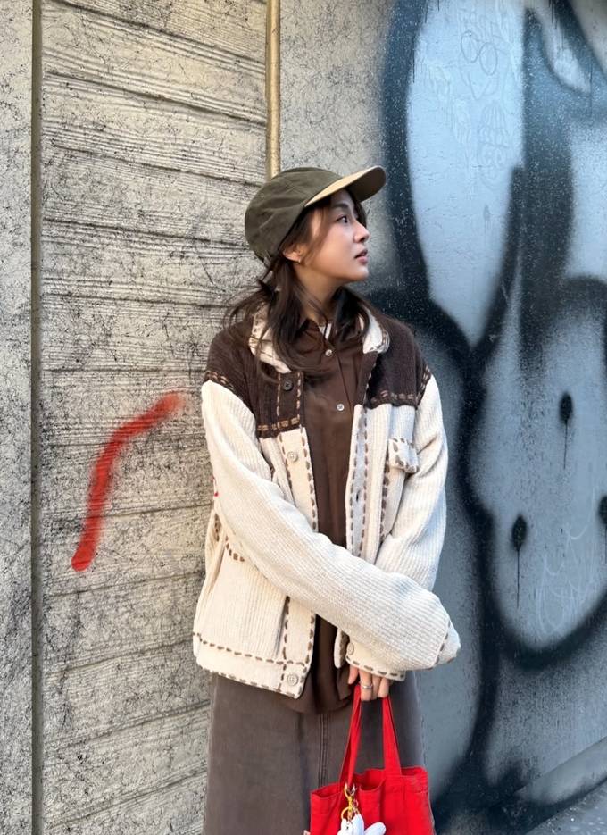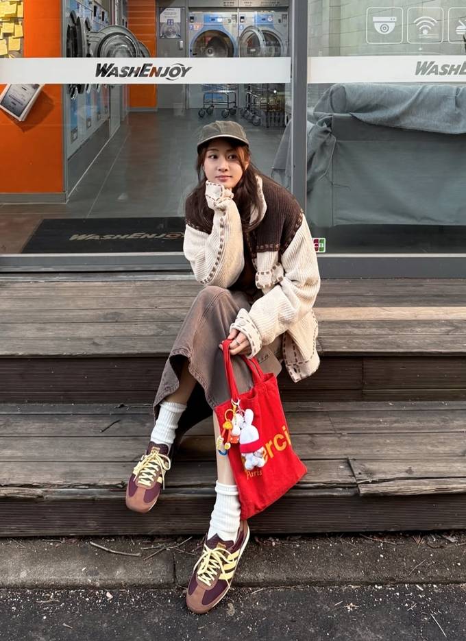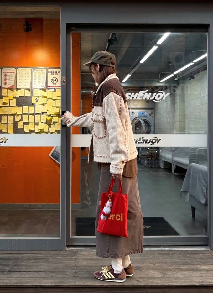 카키 컬러의 볼캡을 더해 캐주얼한 스트리트 감성을 강조했고, 레드 컬러의 토트백으로 포인트를 주며 전체 룩에 생기를 불어넣었다.