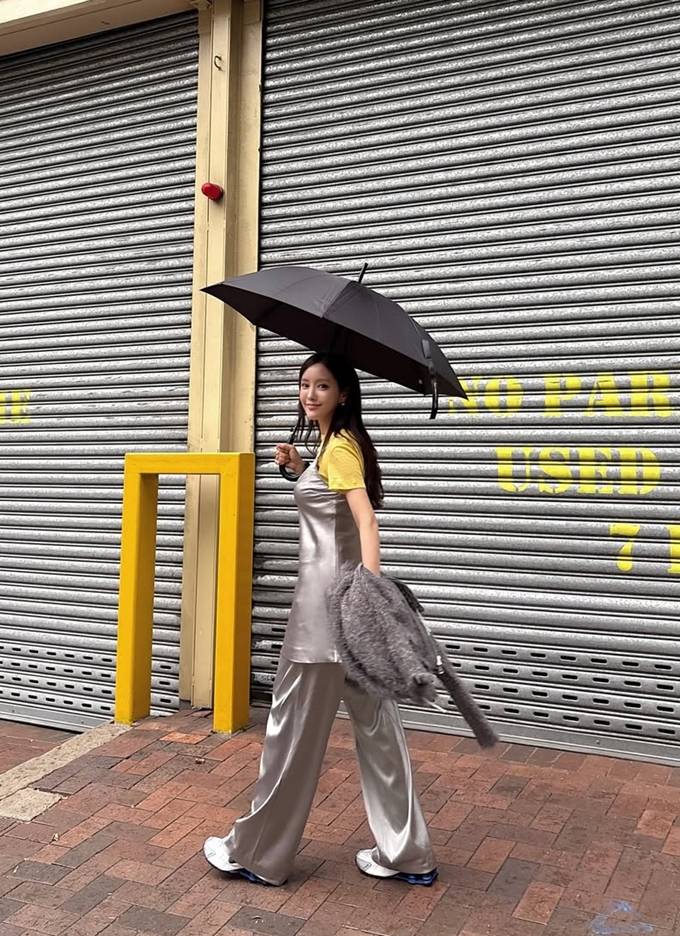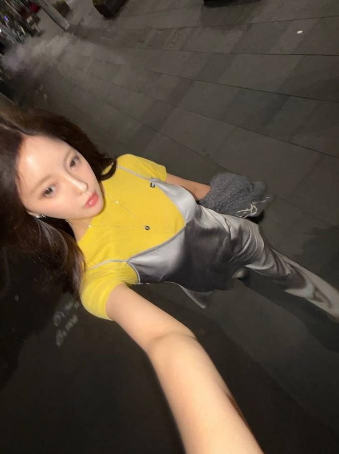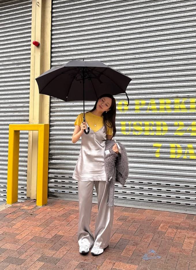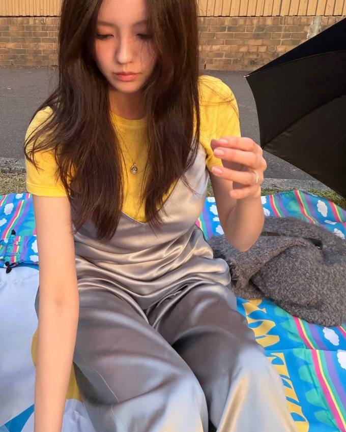 공개한 사진에서 효민은 옐로 컬러의 반팔 티셔츠 위에 은은한 광택 실크 소재의 슬립 톱과 팬츠를 레이어드한 오버핏 뷔스티에룩으로 내추럴하면서도 트렌디한 무드를 연출했다.