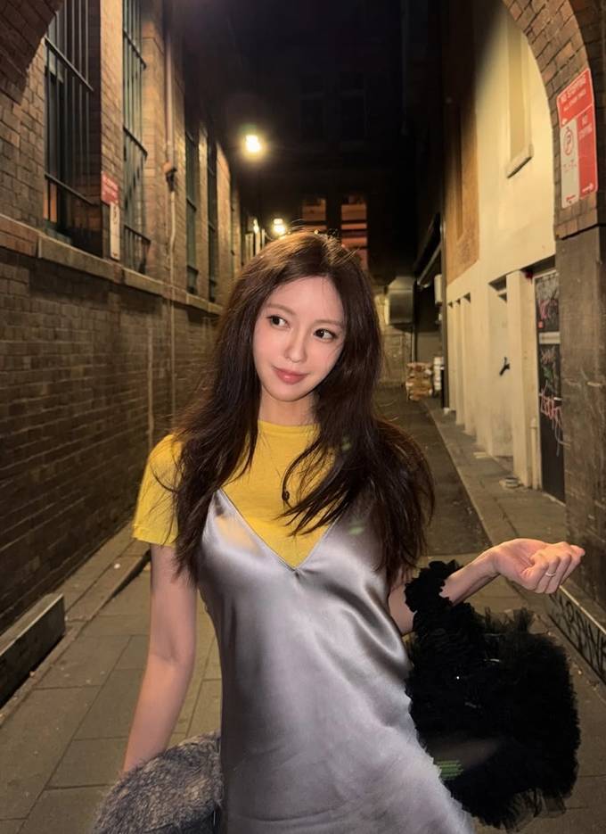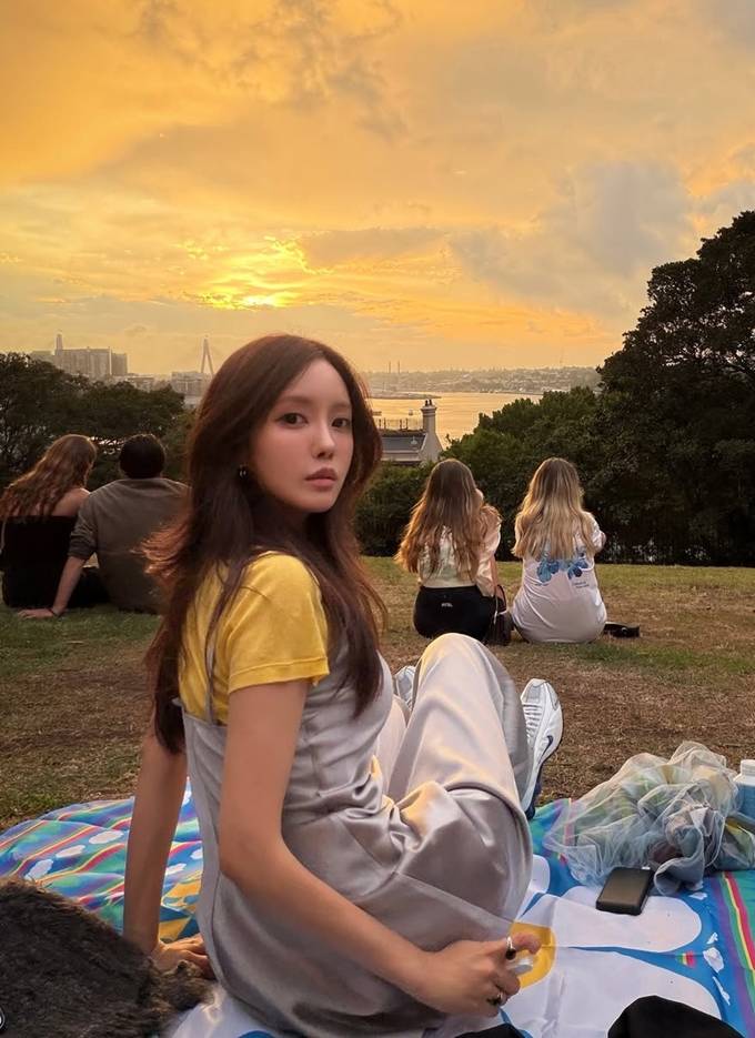 가수 효민이 호주 시드니에서 로맨틱한 실크 슬립 뷔스티에 피크닉룩으로 저녁 노을을 즐겼다.