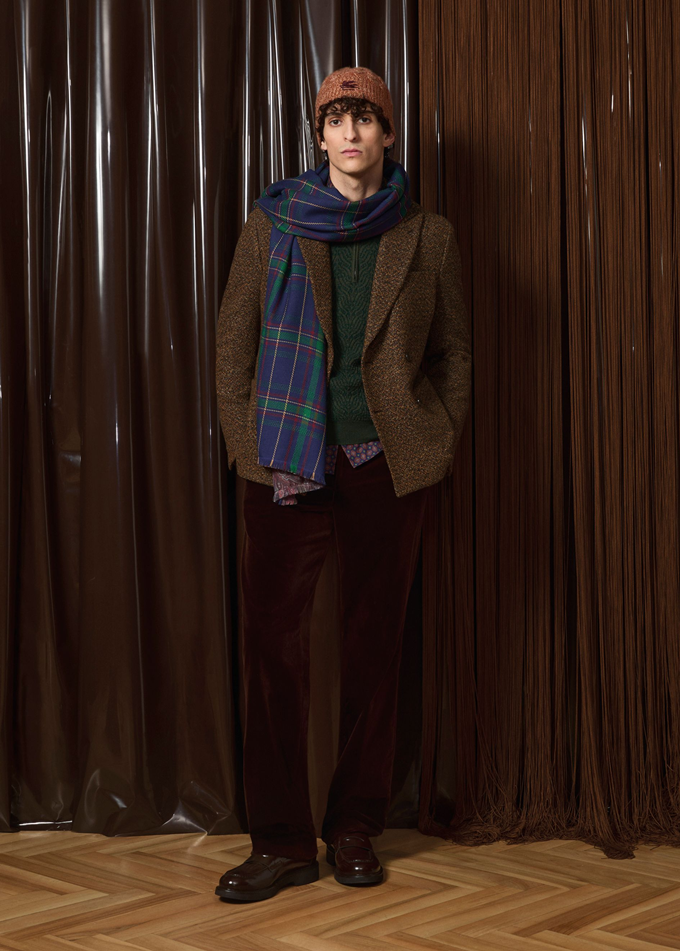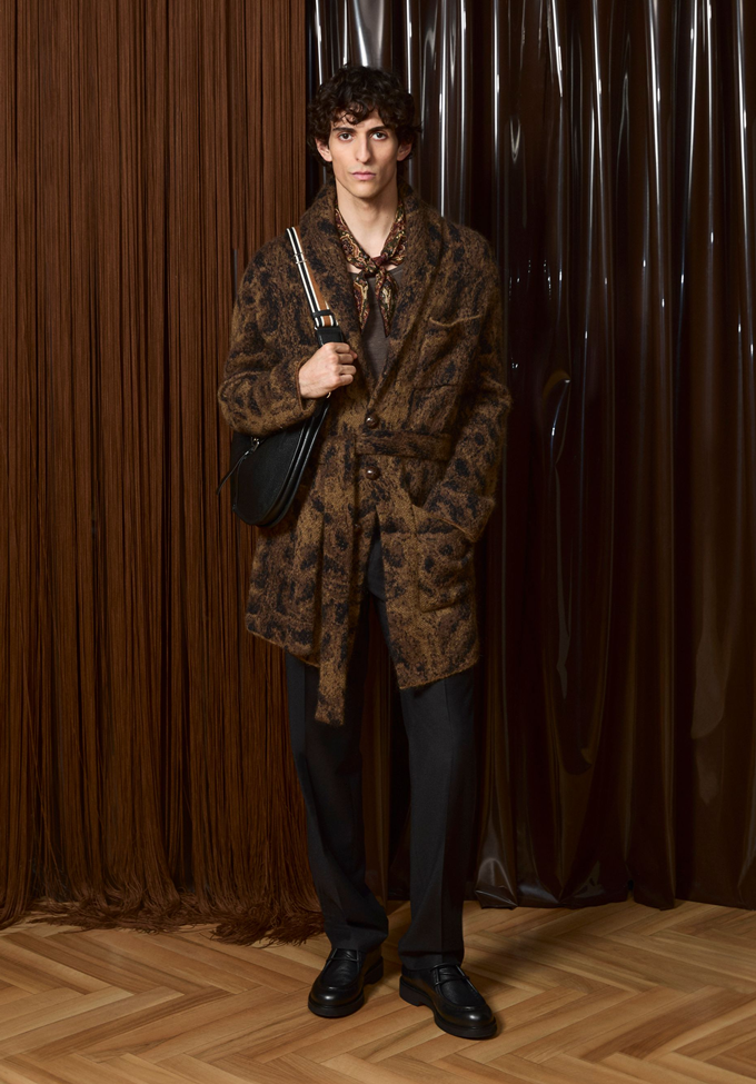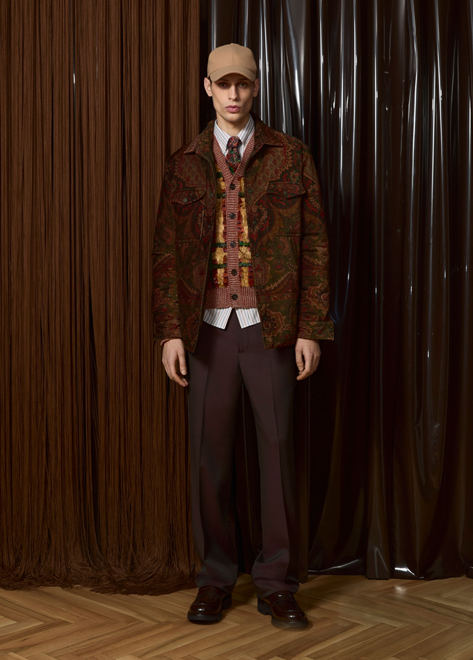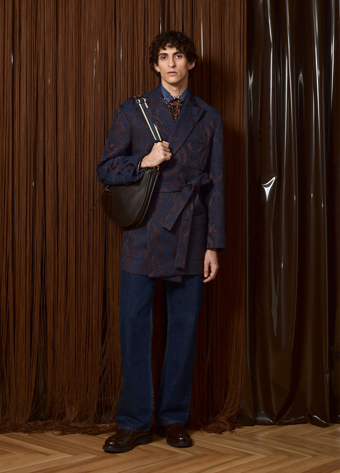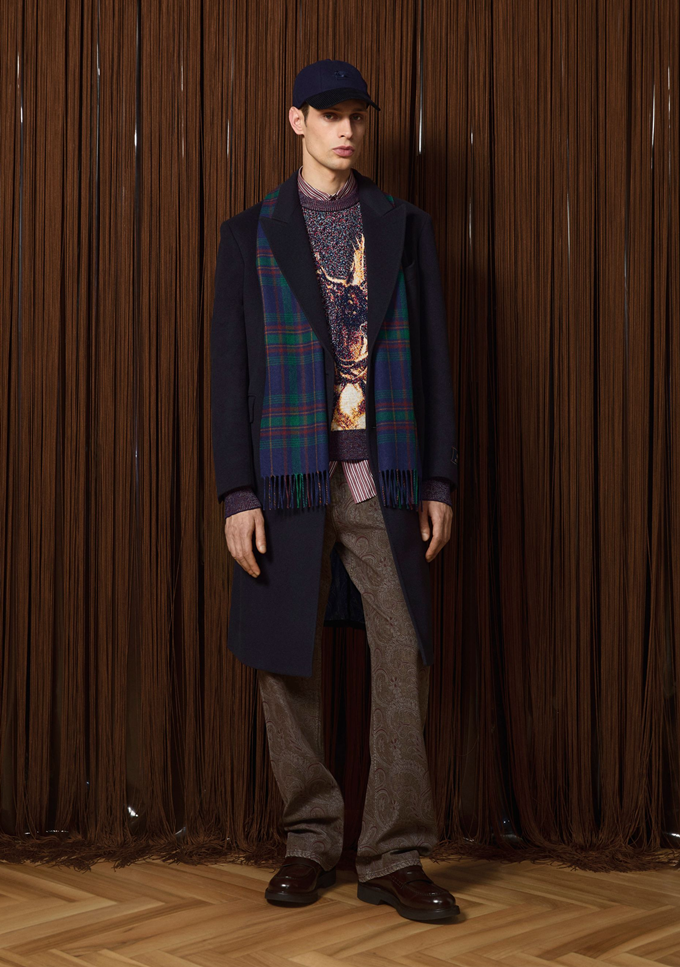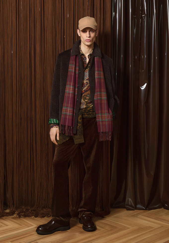 페이즐리는 팬츠와 스카프, 로브 코트 전반에 걸쳐 확장되며 컬렉션에 에트로 특유의 정체성을 더한다. 허리에 묶은 스웨터, 부드럽고 여유로운 볼륨감의 백, 깊게 눌러쓴 캡은 자연스럽고 캐주얼한 태도를 완성한다.