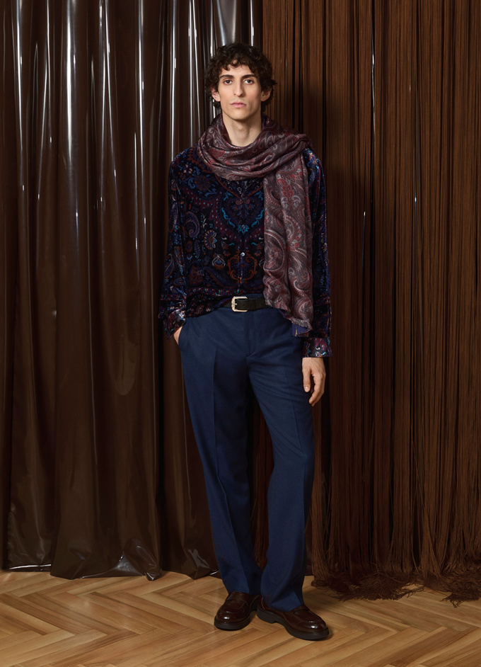 벨벳 위에 프린트된 페이즐리 모티프 패턴이 풍성하게 펼쳐지고, 로브와 파자마는 실내와 실외의 경계를 허물며 스타일링된다.