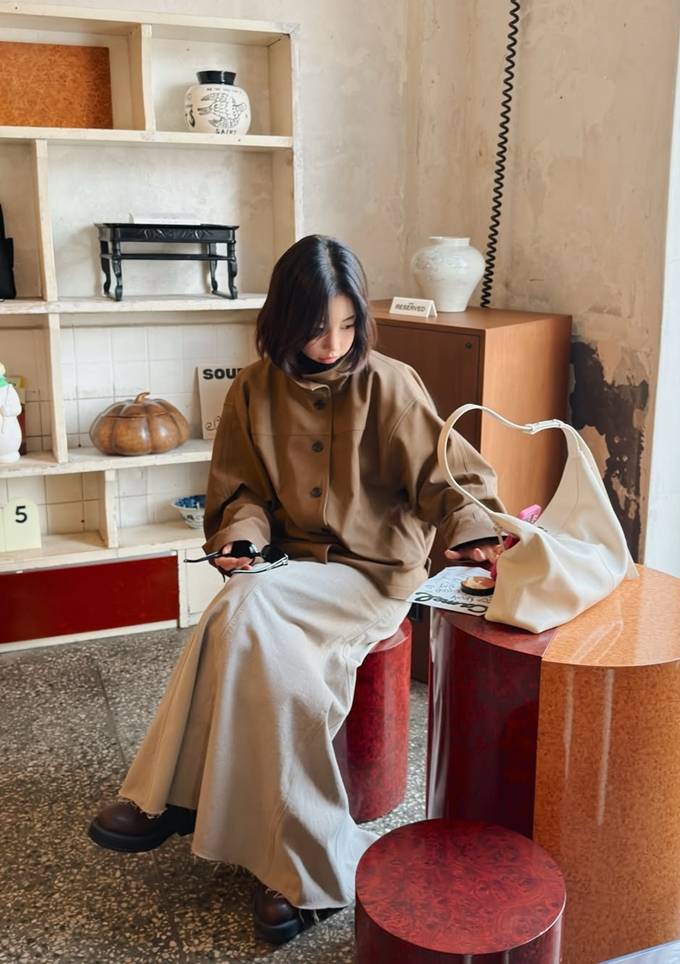 특히 상의의 컴팩트한 길이감에 대비되는 롱한 스커트를 하의로 착용해 전체적인 비율을 돋보이게 했다.