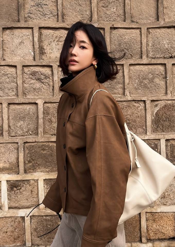 공개한 사진에서 기은세는 브라운 컬러의 하이넥 재킷에 은은한 결이 느껴지는 롱 스커트를 매치해 단정하면서도 멋스러운 간절기룩을 완성했다.