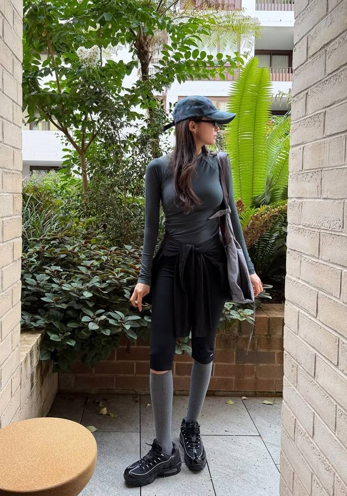 또 여기에 니삭스와 스니커즈를 매치해 슬림한 애슬레저룩을 완성했다.