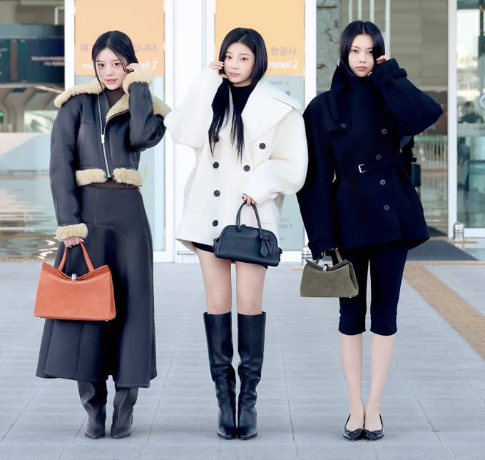 아일릿 윤아·원희·민주, 구조적인 실루엣 3인 3색 감각적인 윈티룩 파리 출국길