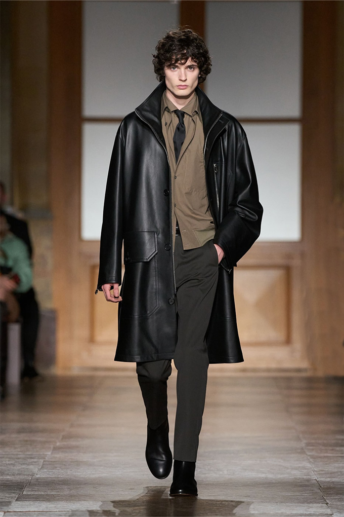 남성복의 전형적인 아이템 블루종, 파카, 피코트, 더블 브레스트 수트를 비롯해 지난 시즌 실루엣을 차용해 에르메스 특유의 최고급 소재로 자연스러운 스타일을 연출했다.