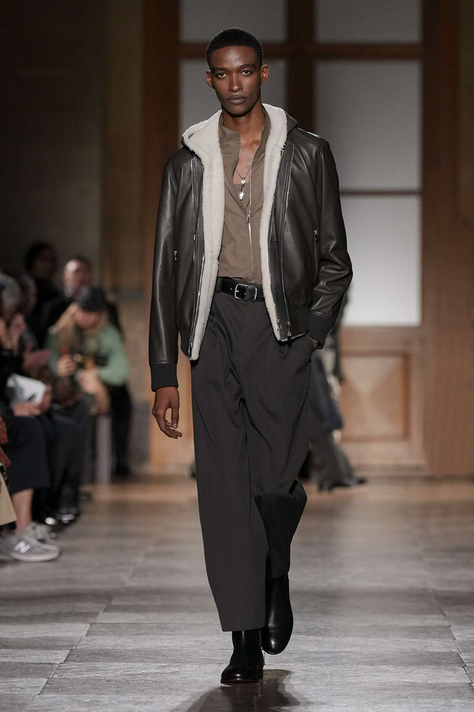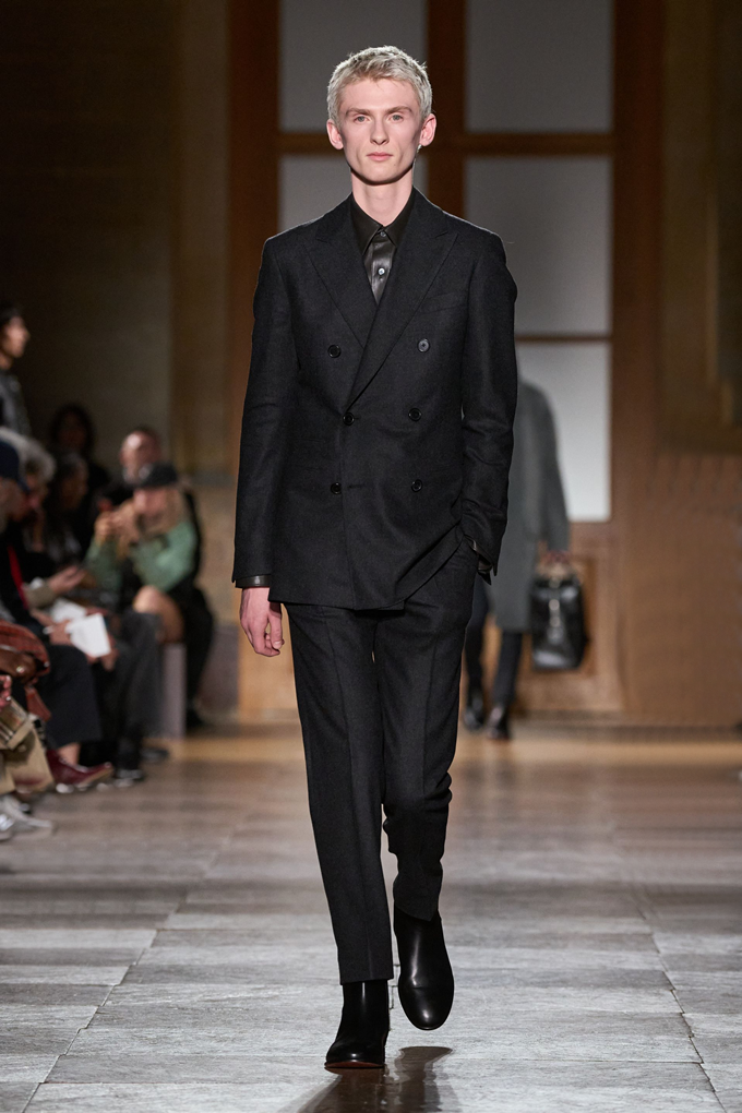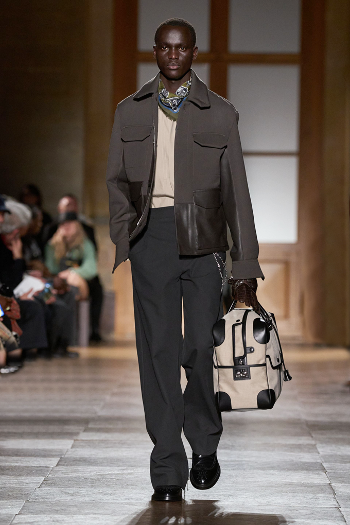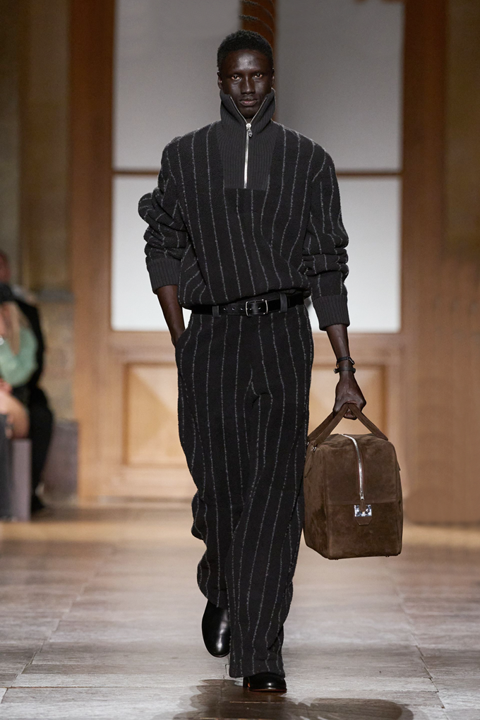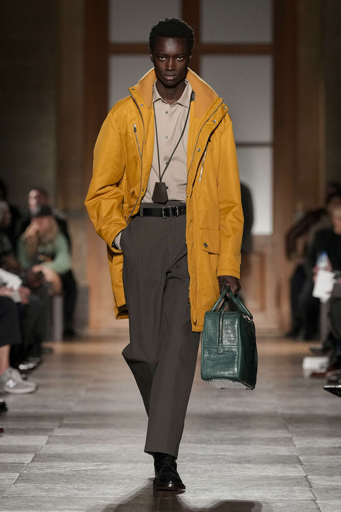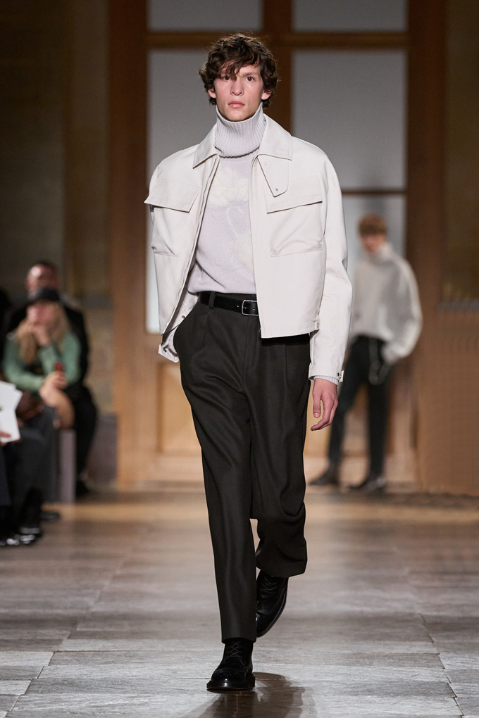 남성복의 전형적인 아이템 블루종, 파카, 피코트, 더블 브레스트 수트를 비롯해 지난 시즌 실루엣을 차용해 에르메스 특유의 최고급 소재로 자연스러운 스타일을 연출했다.