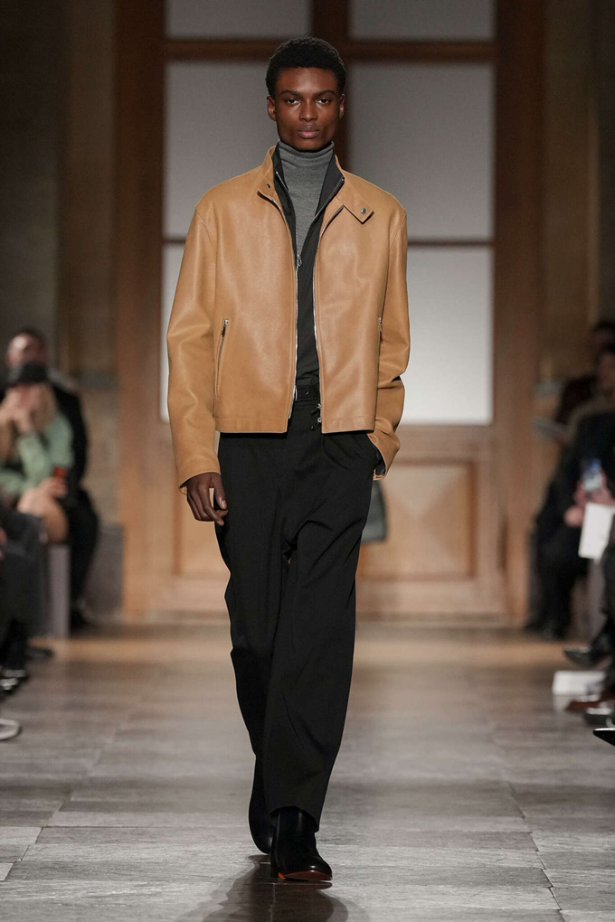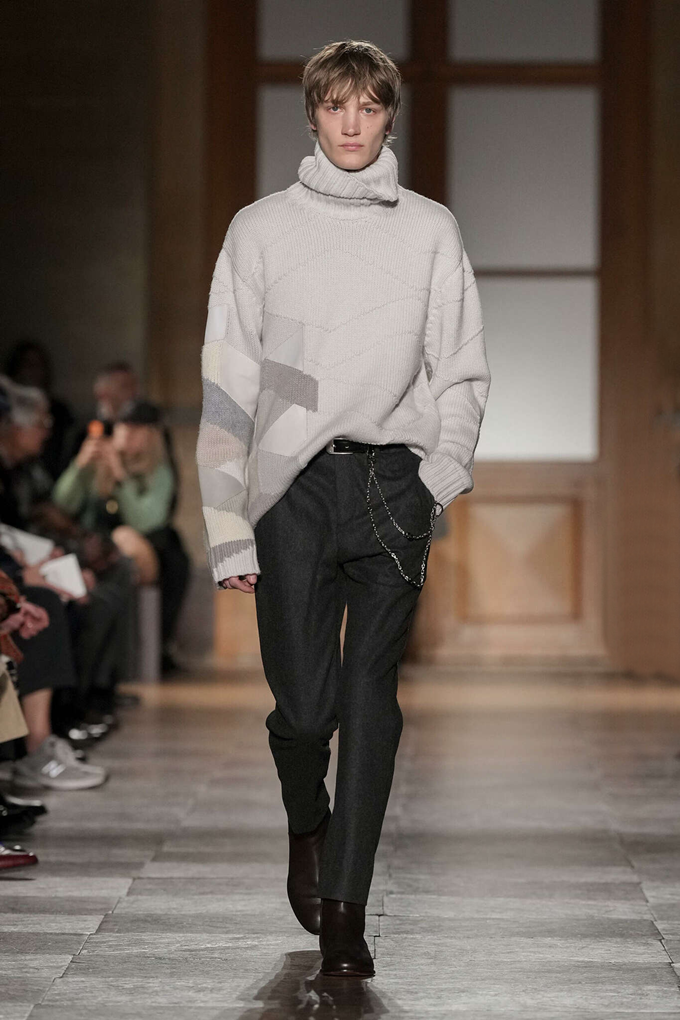 옛 파리 증권거래소였던 브롱니아르 궁전에서 열린 에르메스 남성복 컬렉션은 니샤니앙의 과거 수많은 런웨이 무대 영상이 상영이 상영되었으며 클래식 코드를 현대적인 감각으로 재해석한 절제되고 편안한 분위기의 시티룩을 선사했다.