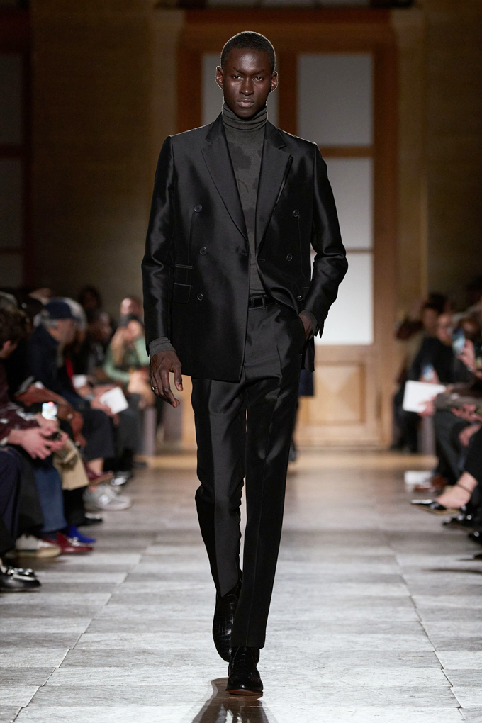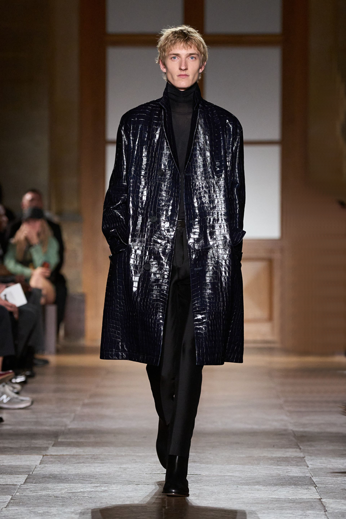 에르메스의 시그니처 소재인 송아지 가죽과 함께 고급스러운 악어 가죽, 기능성 새틴, 그리고 턱시도 스타일의 이브닝웨어에 사용된 초경량 울과 실크 페일 소재가 더해져 세련된 분위기를 완성했다.