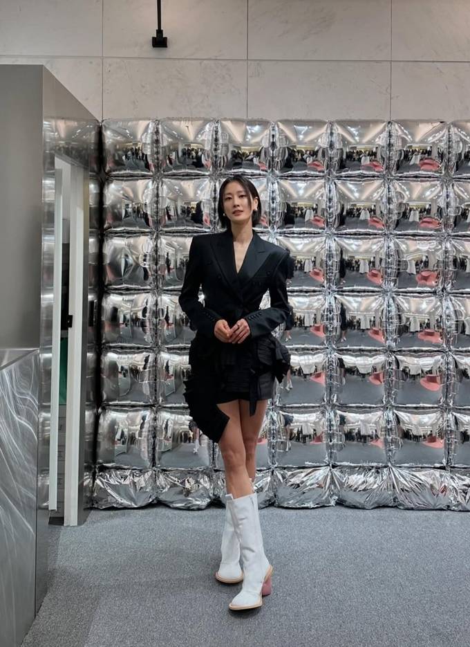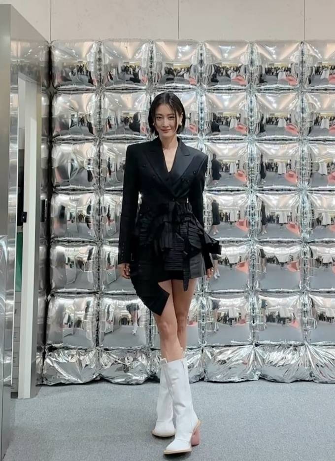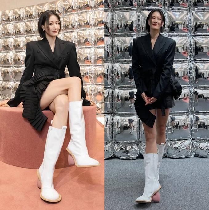 또 여기에 화이트 롱부츠를 매치해 우월한 모델 핏을 더욱 돋보이게 했다.
