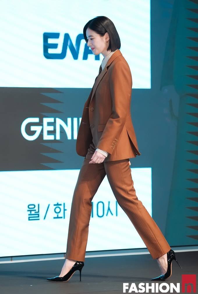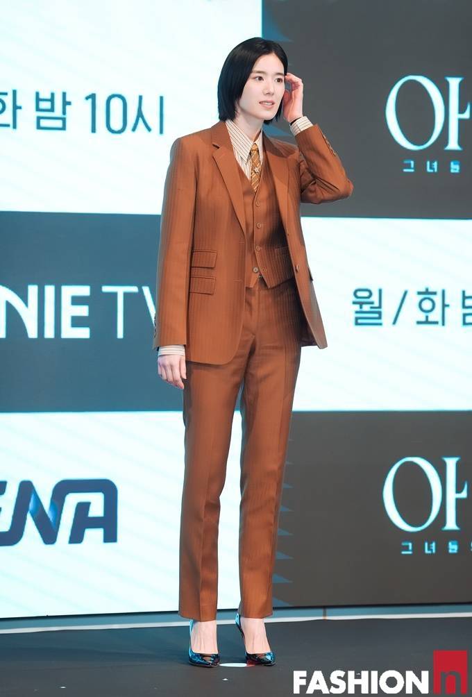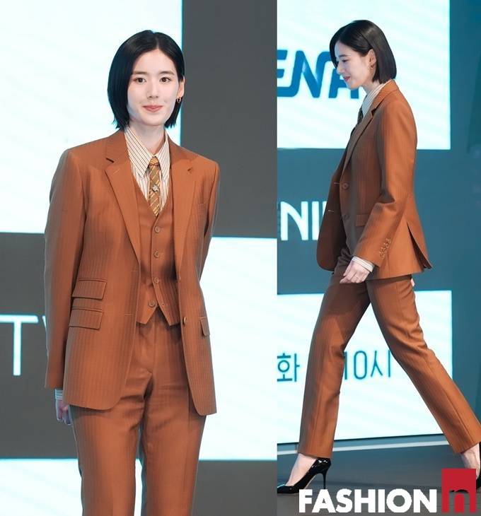 이날 정은채는 정교한 테일러링이 돋보이는 브라운 컬러의 재킷과 팬츠, 베스트까지 갖춘 쓰리피스 수트를 완벽하게 소화했다.