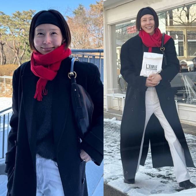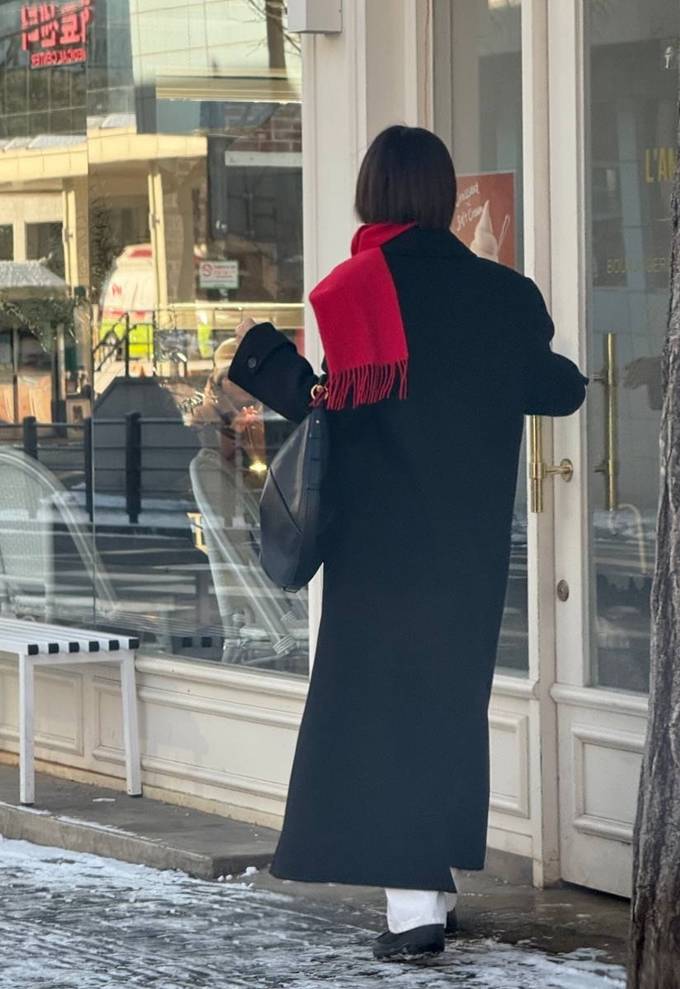 김나영, 겨울 패션도 한 끗 차이! 레드 머플러와 헤어밴드로 포인트 패셔니스타의 코트룩