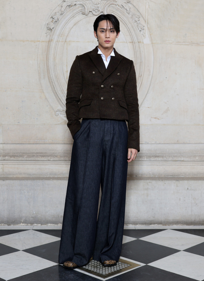 7. 세븐틴 민규는 파리 패션위크 디올 2026 F/W 남성복 컬렉션에서 브라운 더블 크롭 재킷과 화이트 셔츠, 와이드 팬츠를 매치해 클래식한 무드를 보여주었다.
