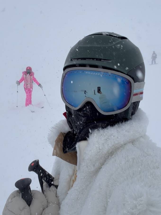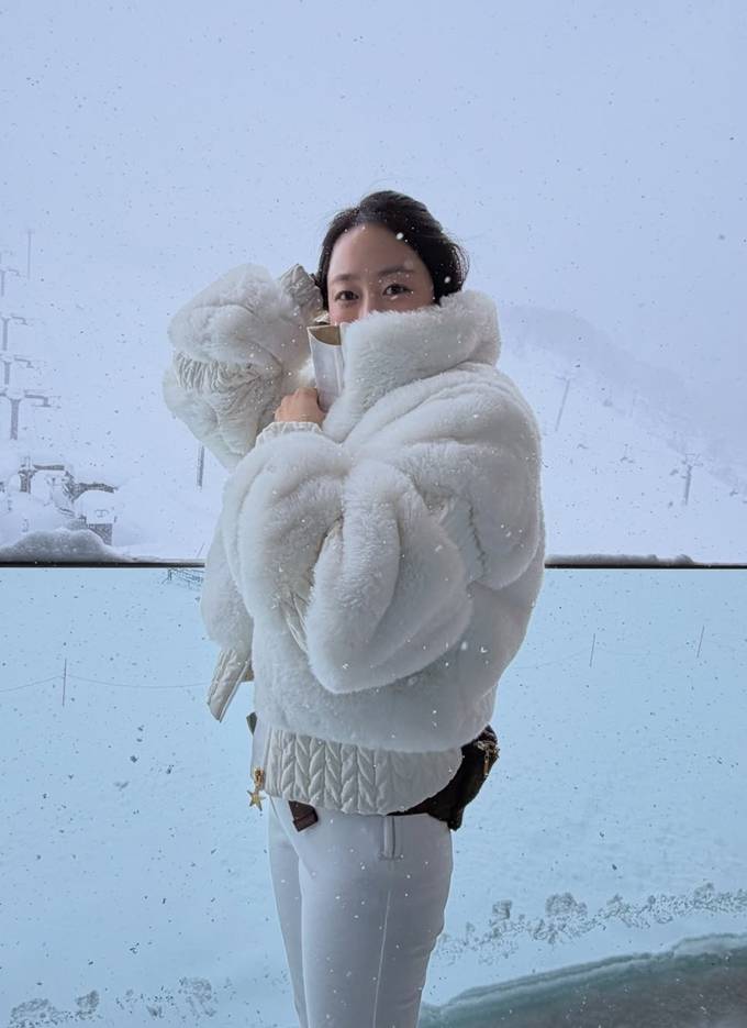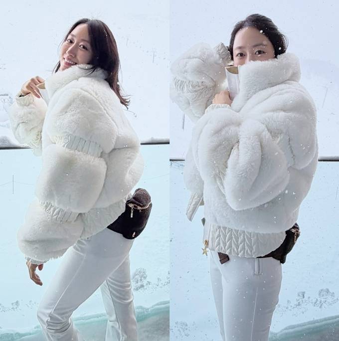 공개한 사진에서 전혜빈은 짧은 기장에 풍성한 볼륨감이 돋보이는 화이트 퍼 패딩 재킷에 슬림한 화이트 팬츠를 매치해 전체적인 비율이 한층 더 길어 보이는 스키룩을 완성했다.