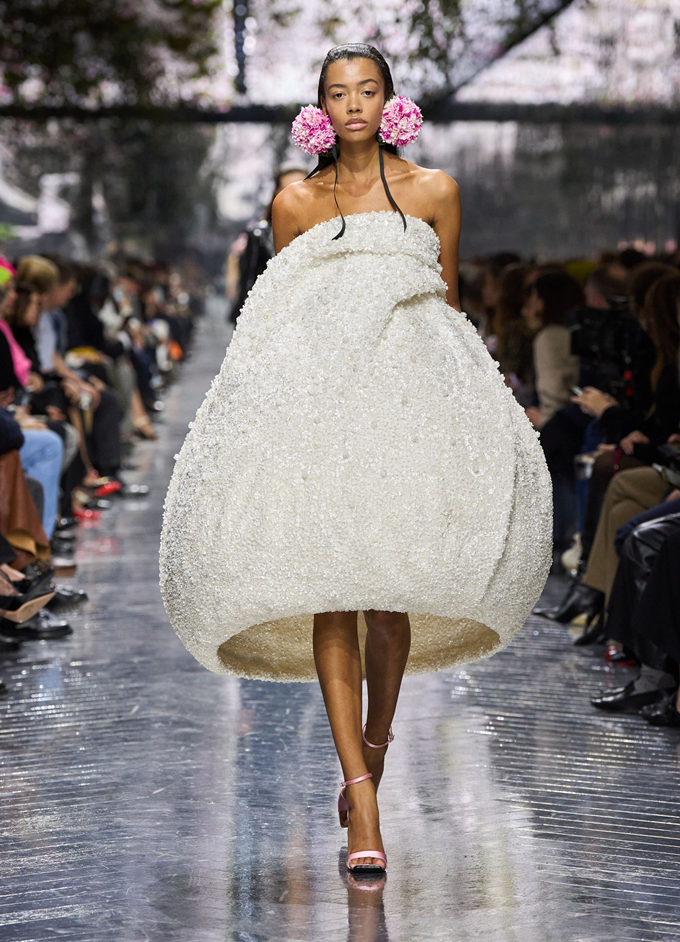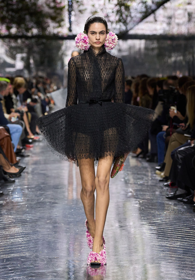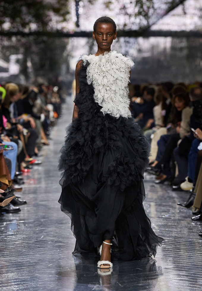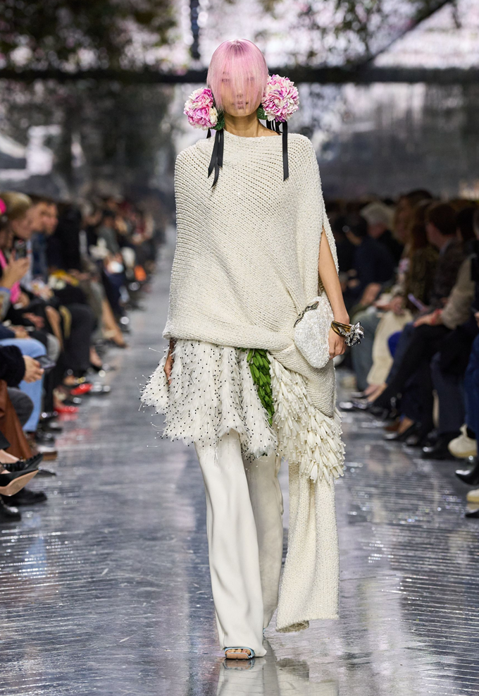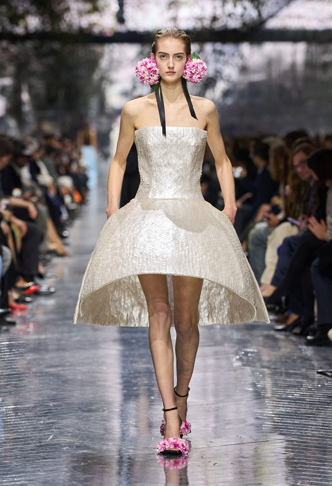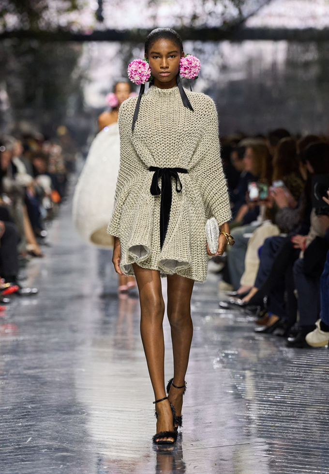 섬세한 실크 재단과 자수, 층층이 쌓인 쉬폰과 오간자, 꾸뛰르 영역으로 확장된 니트웨어는 디올 하우스의 언어를 한층 확장한다.