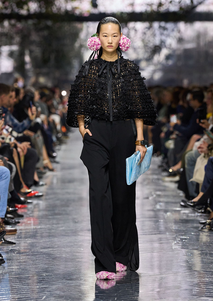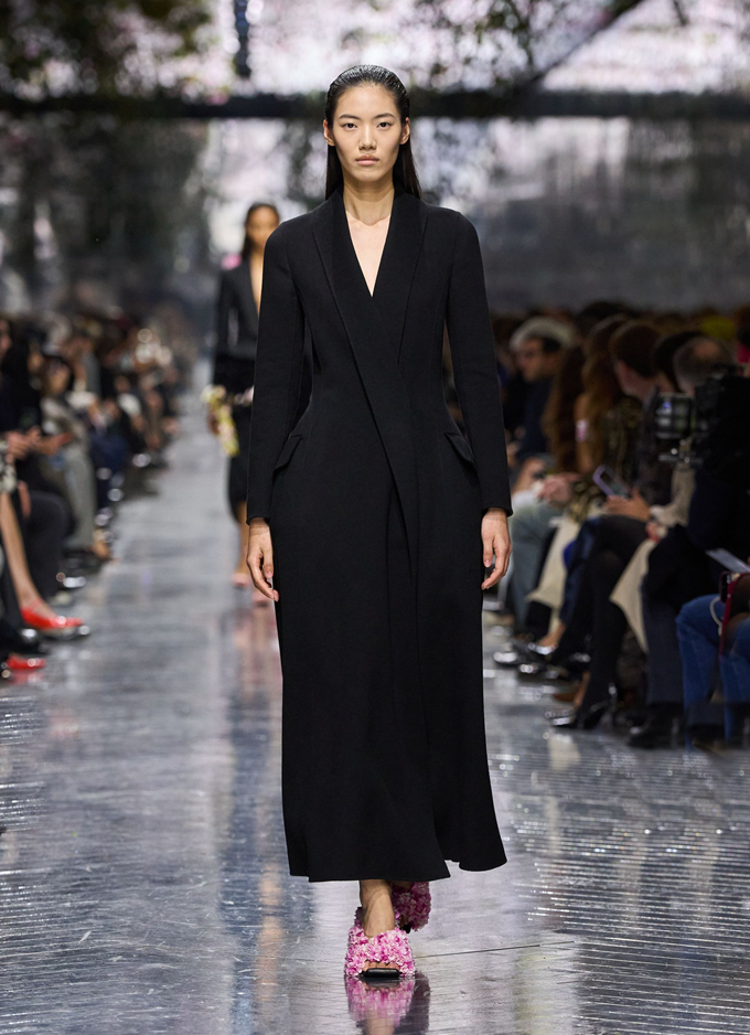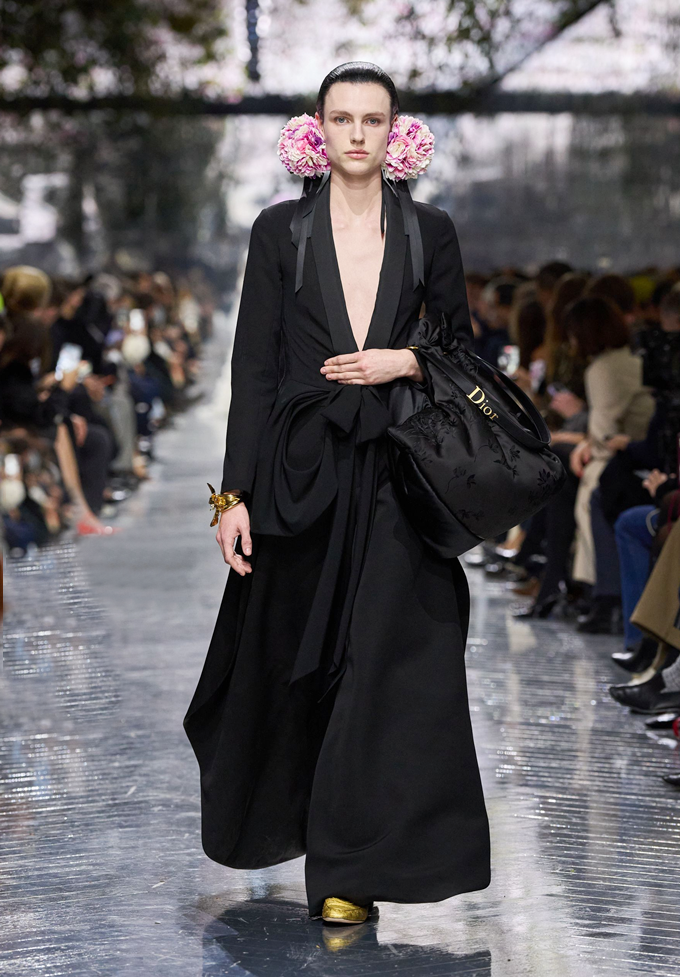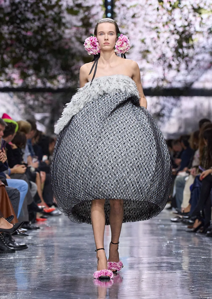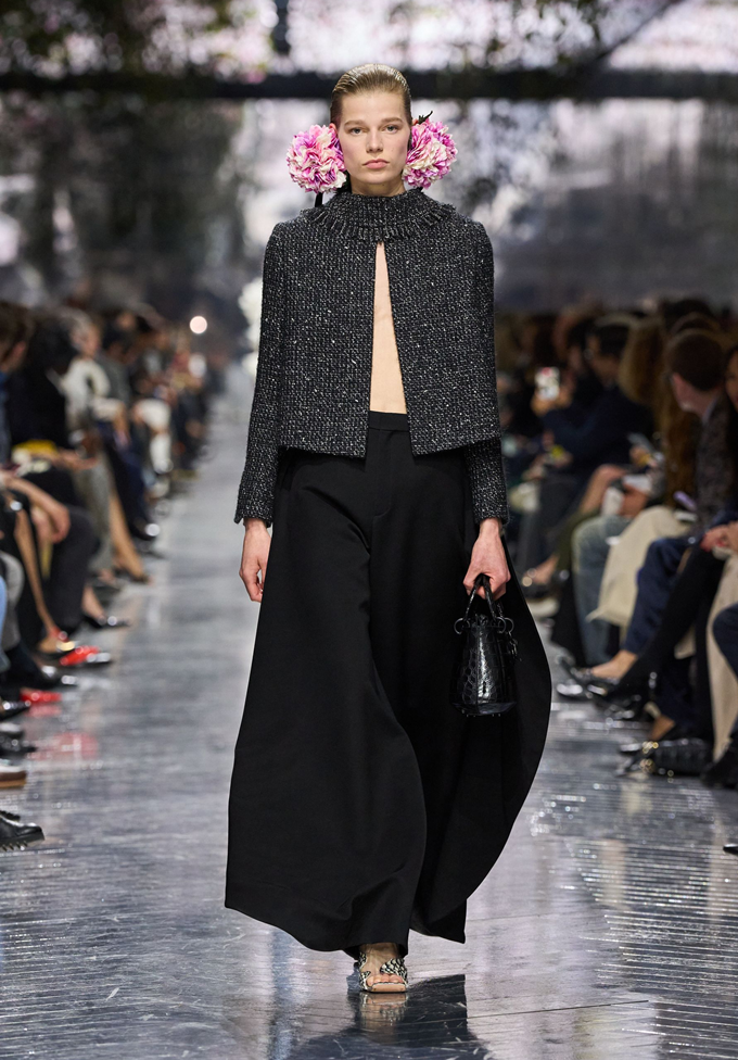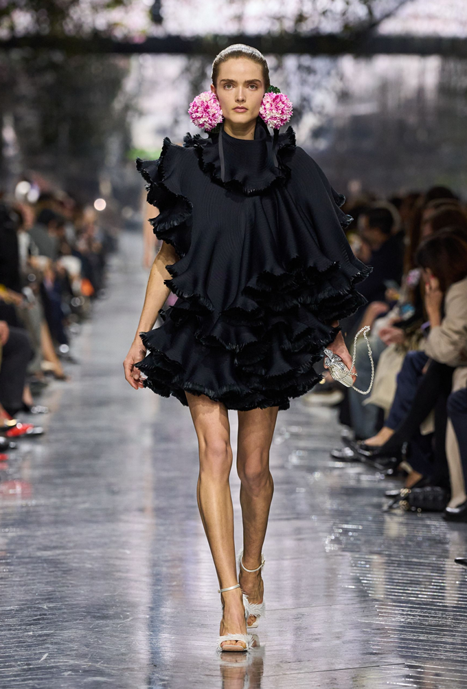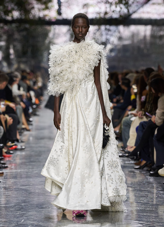 섬세한 실크 재단과 자수, 층층이 쌓인 쉬폰과 오간자, 꾸뛰르 영역으로 확장된 니트웨어는 디올 하우스의 언어를 한층 확장한다.