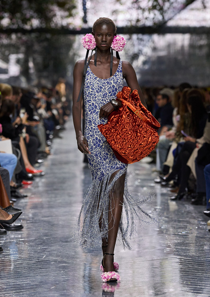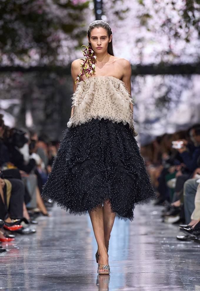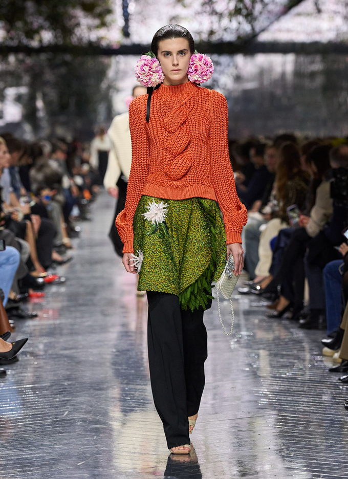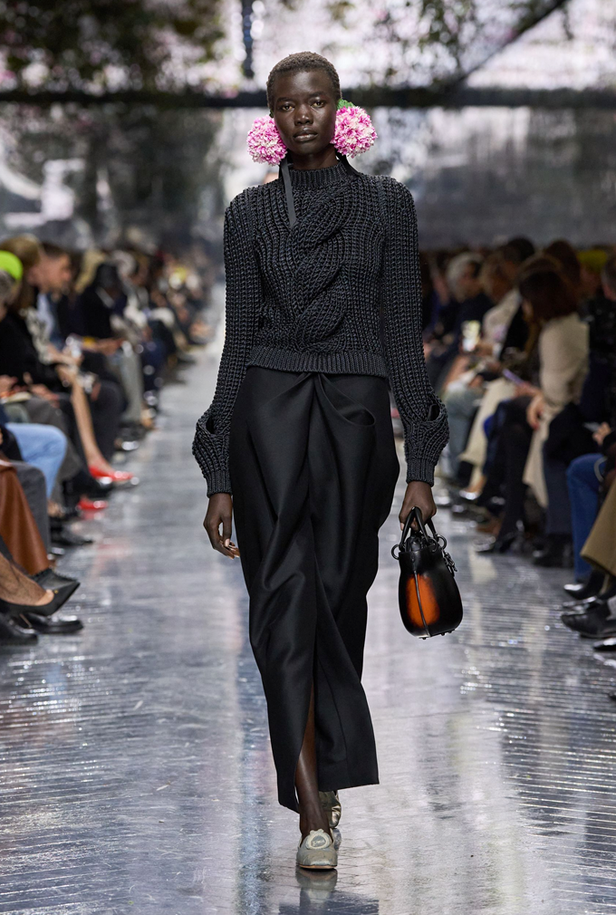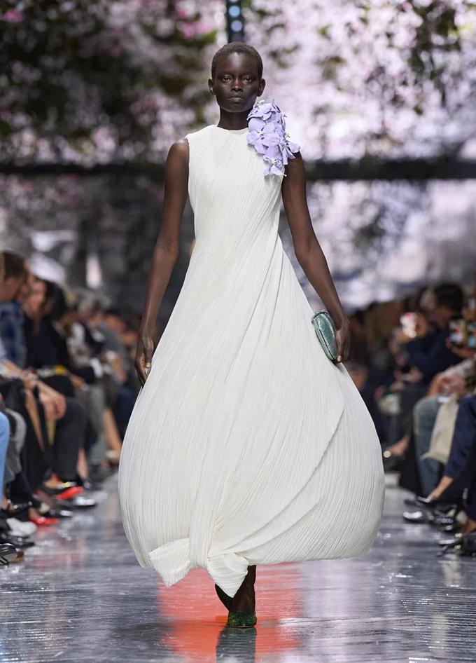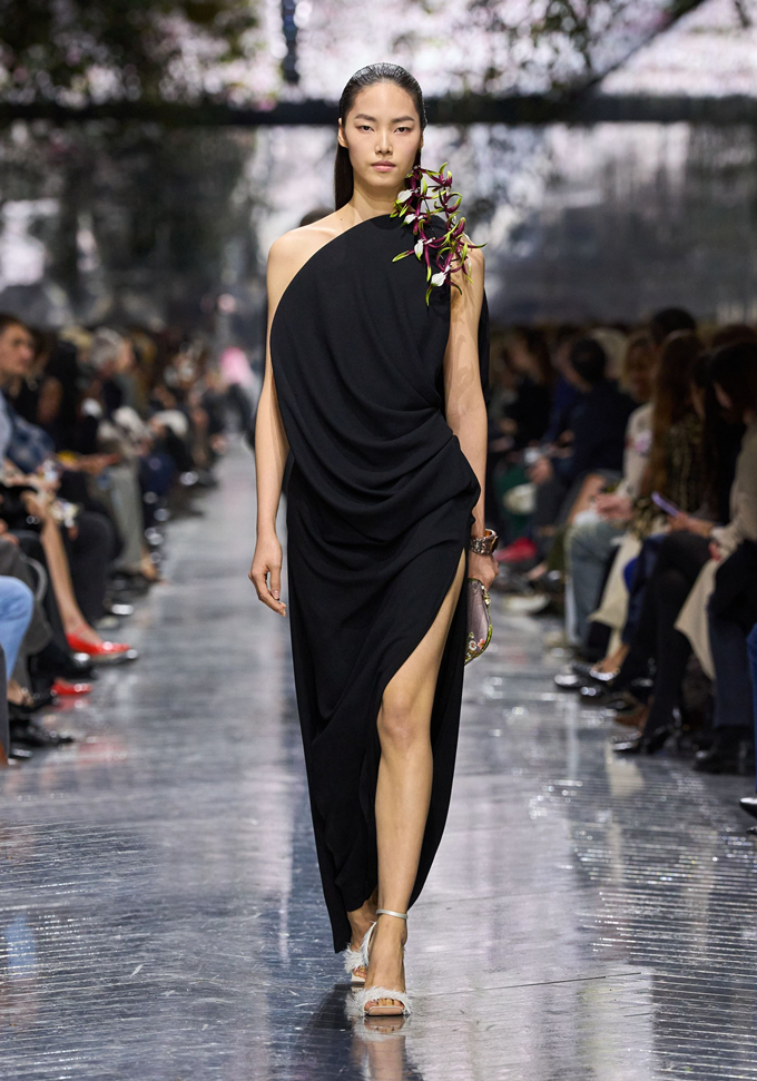 섬세한 실크 재단과 자수, 층층이 쌓인 쉬폰과 오간자, 꾸뛰르 영역으로 확장된 니트웨어는 디올 하우스의 언어를 한층 확장한다.