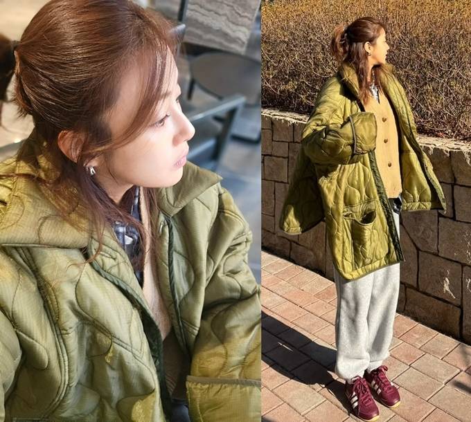 배우 강소라가 할머니 니트 카디건에 깔깔이 패딩 등원룩으로 털털한 미모를 드러냈다.