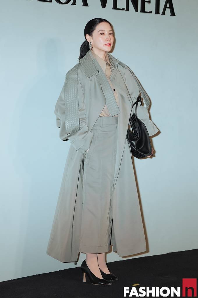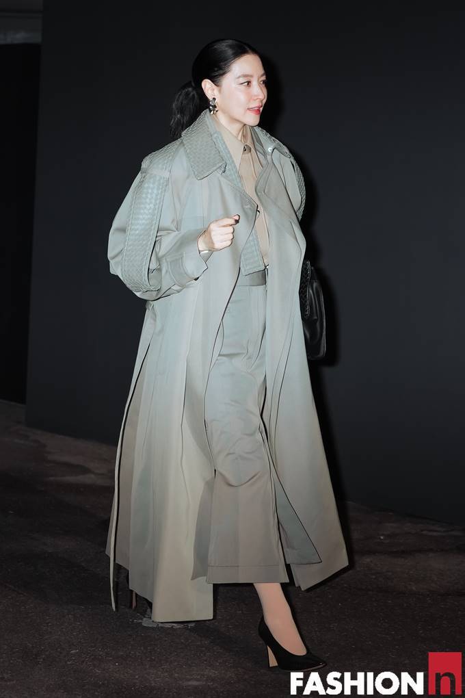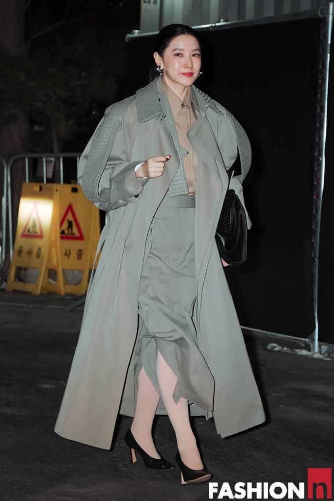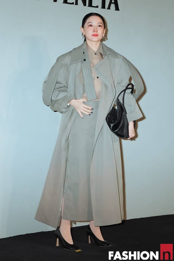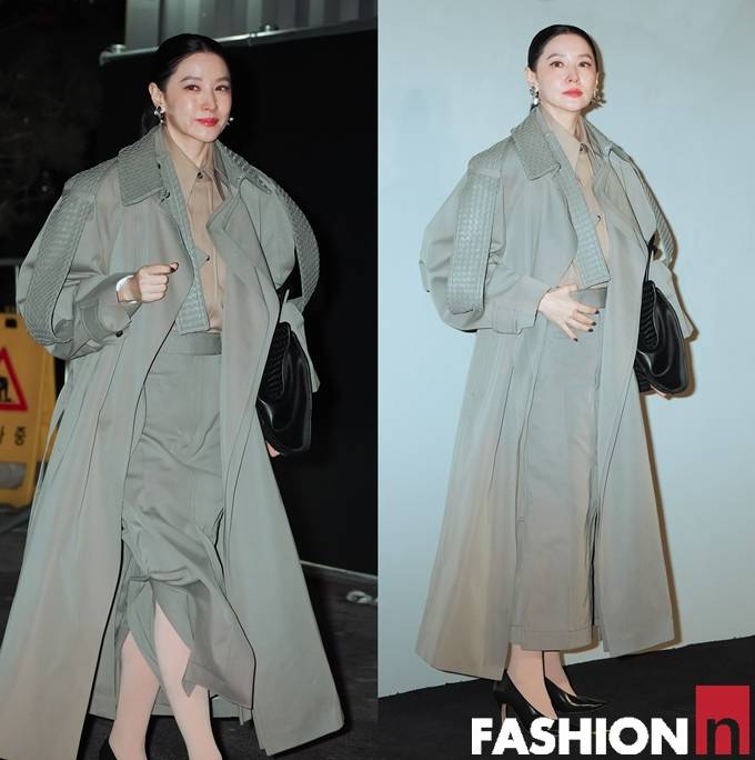 이날 이영애는 톤 다운된 그레이시 카키 컬러에 구조적 실루엣이 돋보이는 롱 코트와 롱 스커트 셋업에 차분한 베이지 셔츠를 매치해 우아하면서도 절제된 감성의 나들이룩을 완성했다.