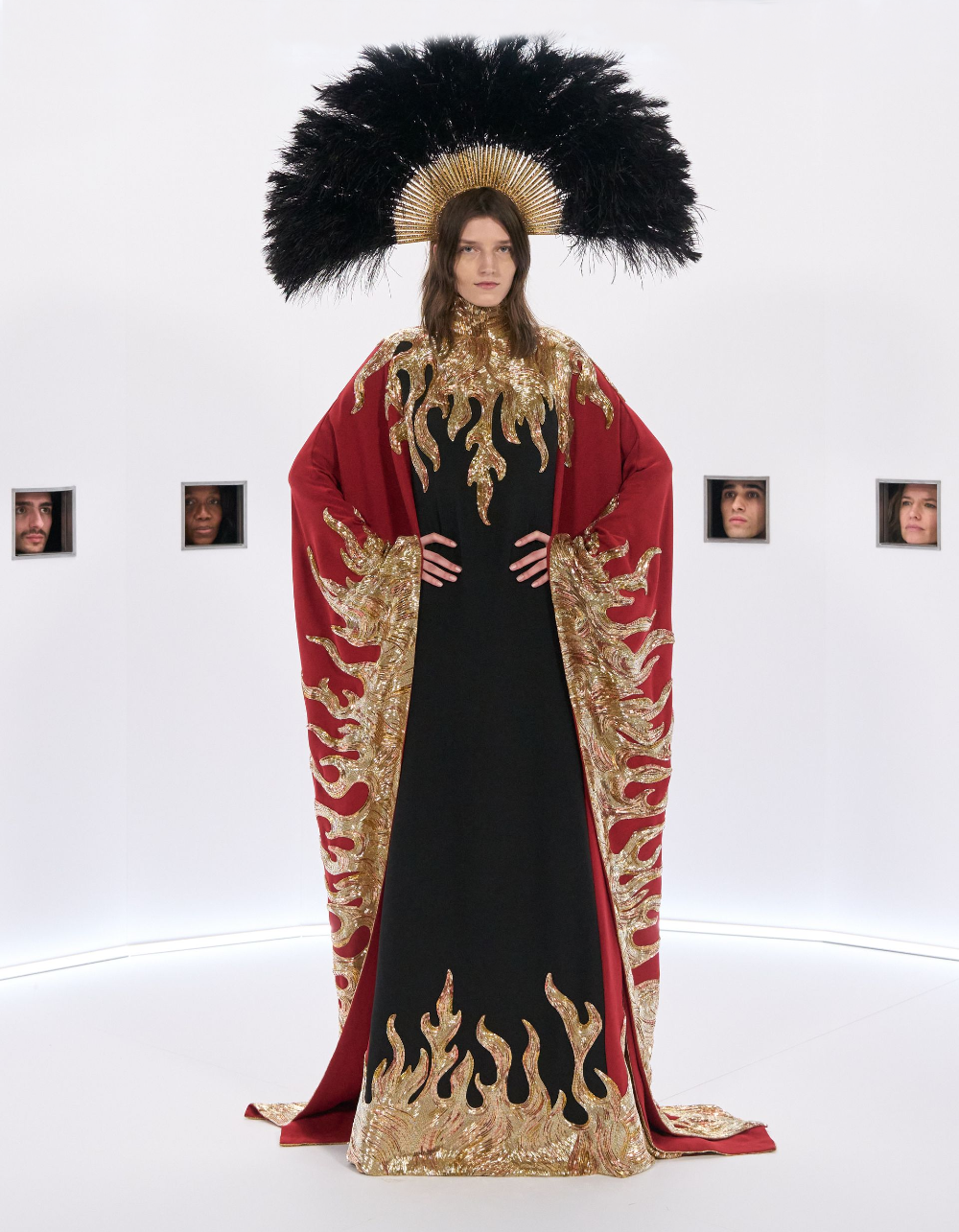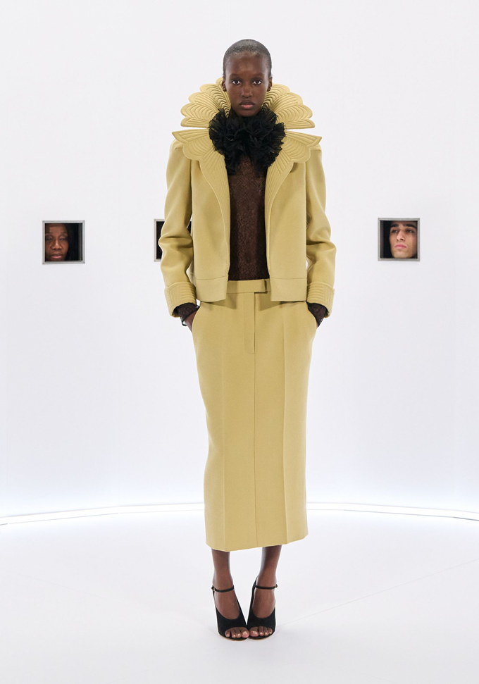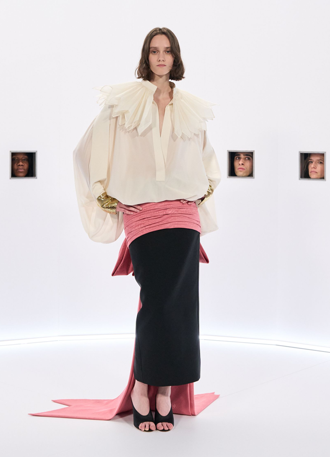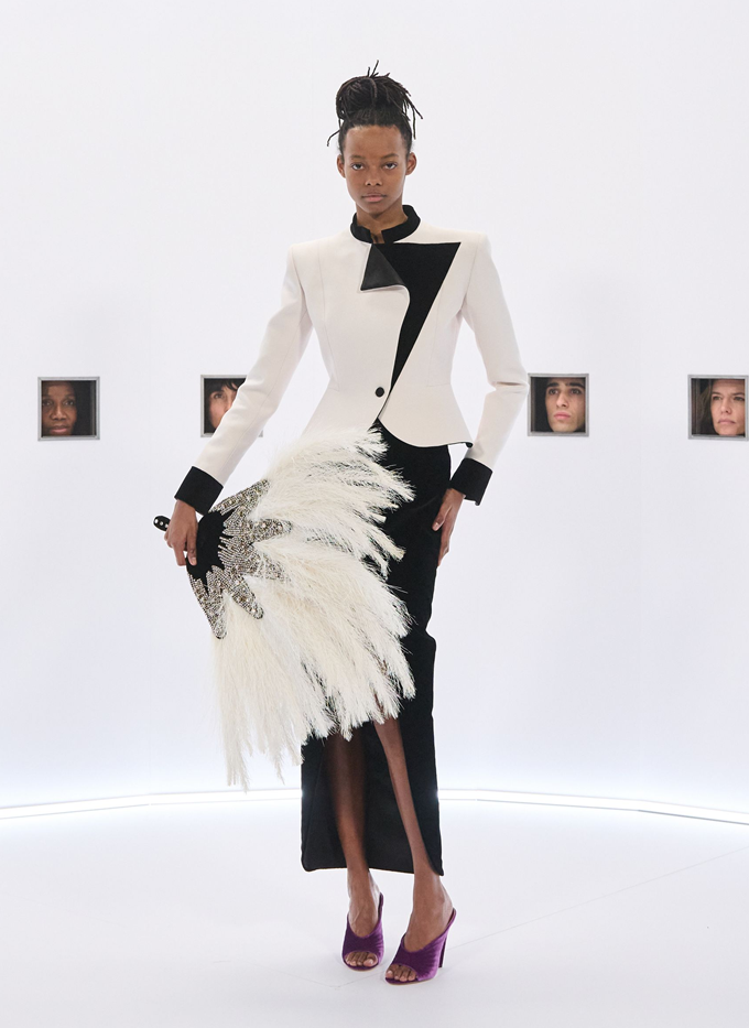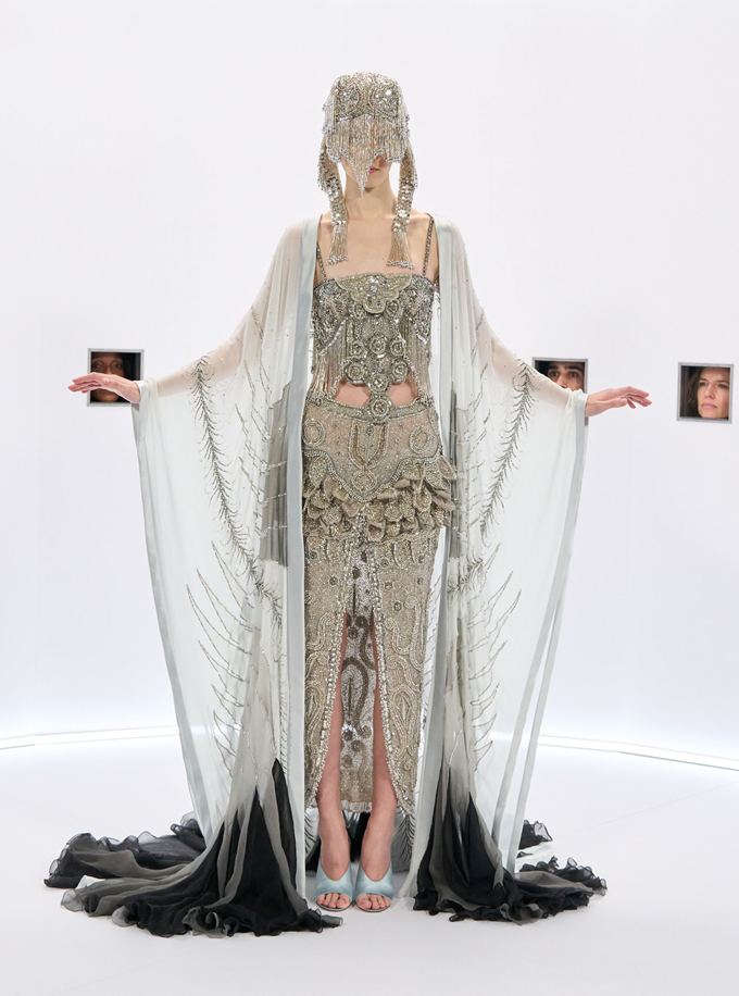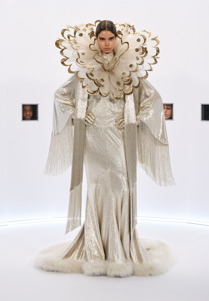 마라부 깃털, 가벼운 망토, 깃털 왕관, 위풍당당한 러프는 과함을 두려워하지 않으면서도 극도의 장인 정신으로 절제된 연극적인 분위기를 자아냈다.