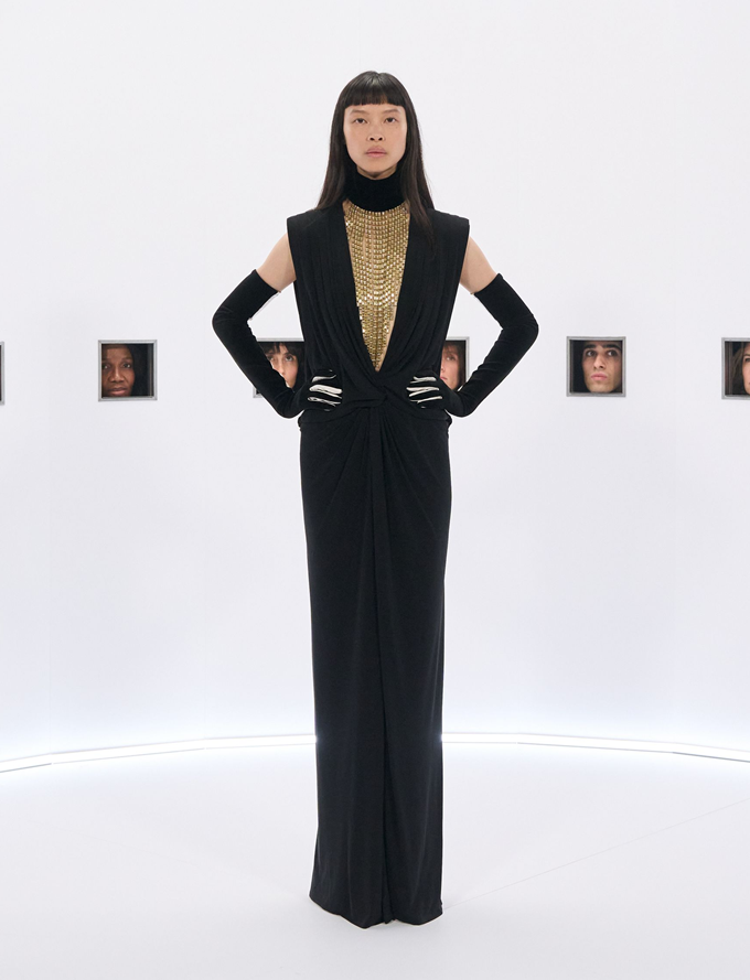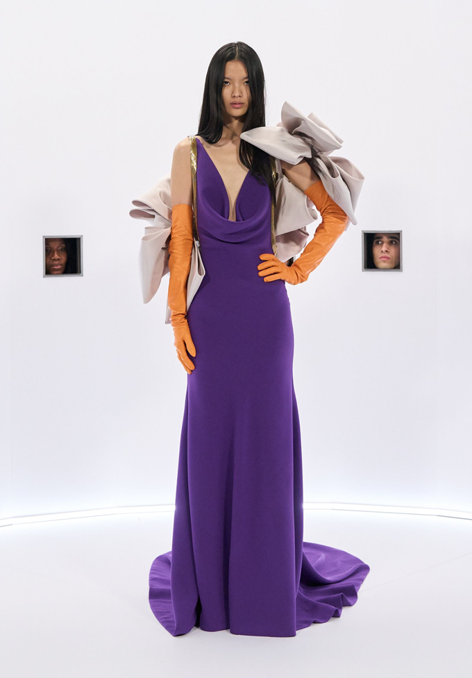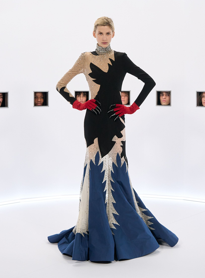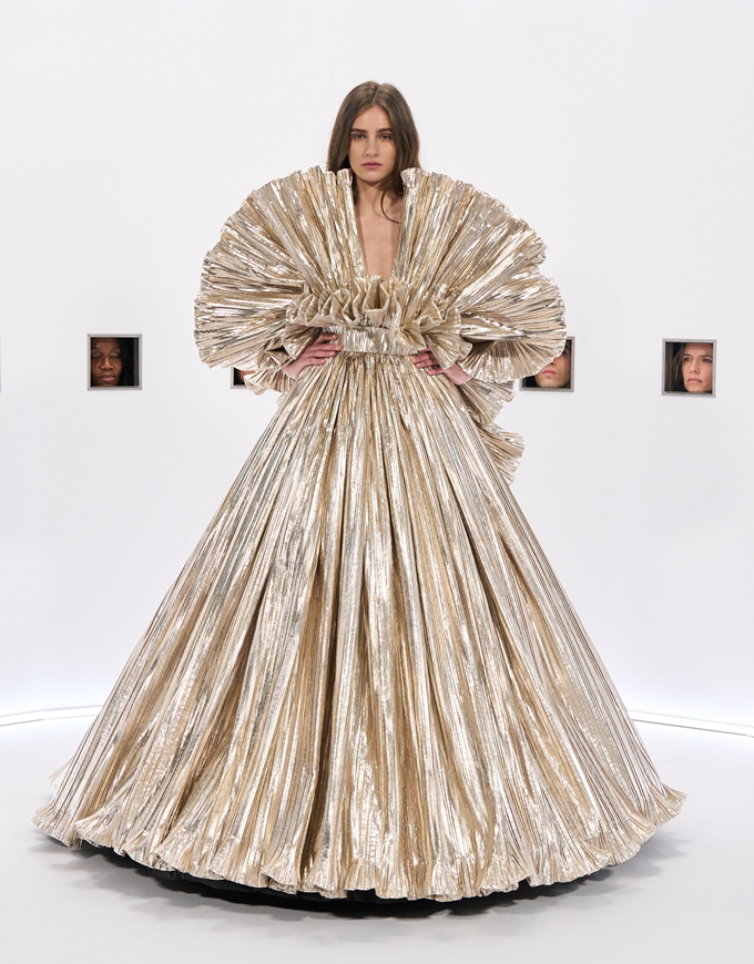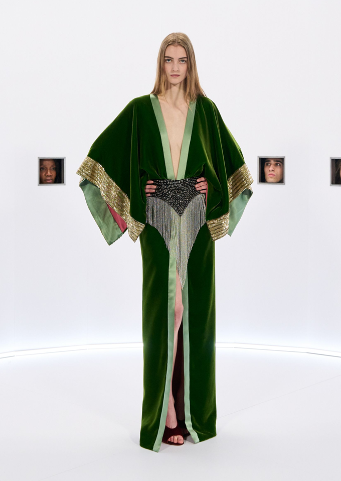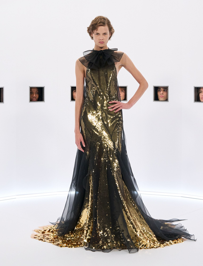 알레산드로 미켈레 고유의 맥시멀리즘 미학은 영화배우를 연상시키는 드레스로 단순히 캐릭터보다 무대 위의 존재감을 가진 올드 할리우드 시대의 화려한 의상을 소환했다.