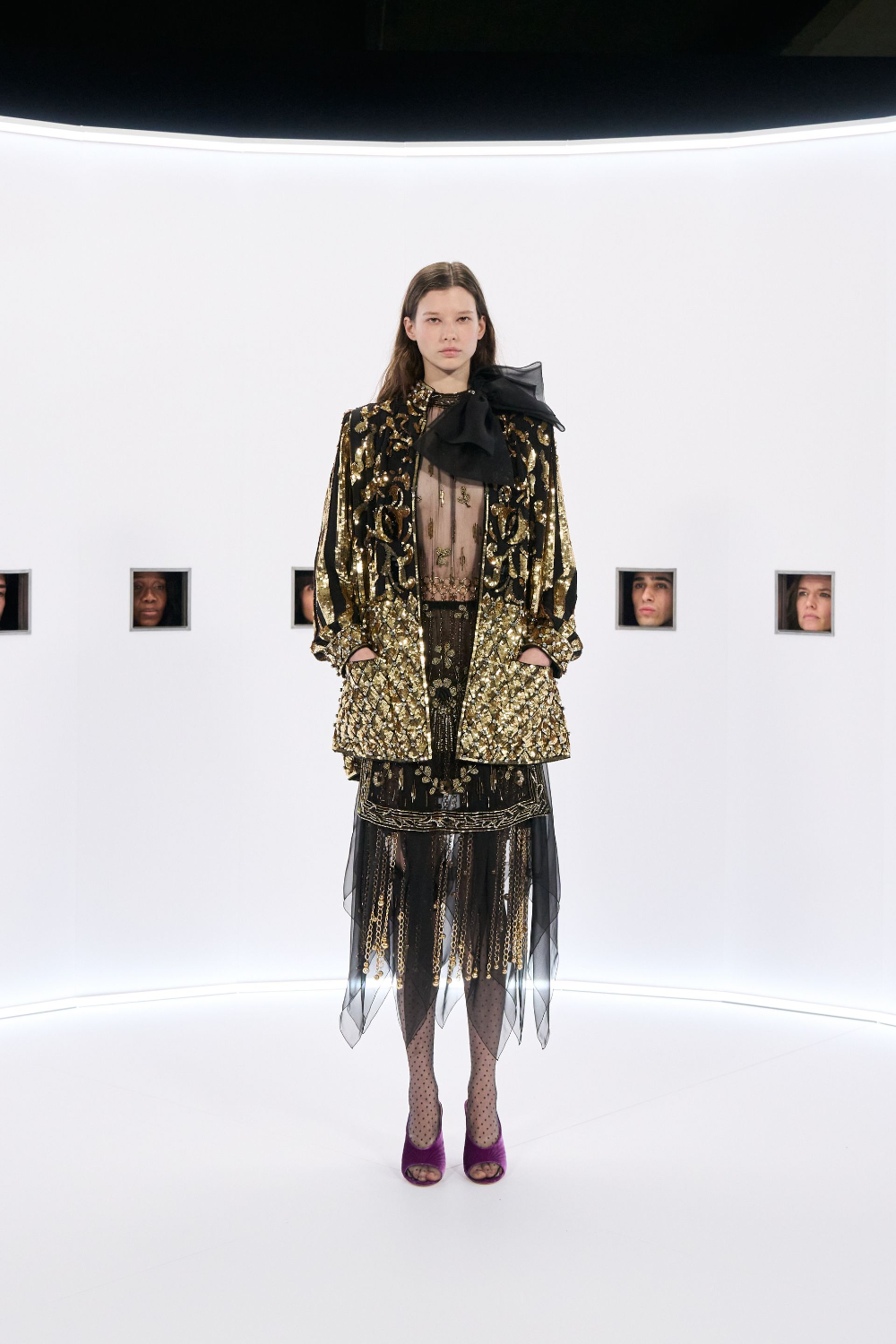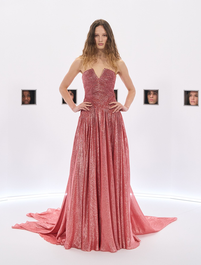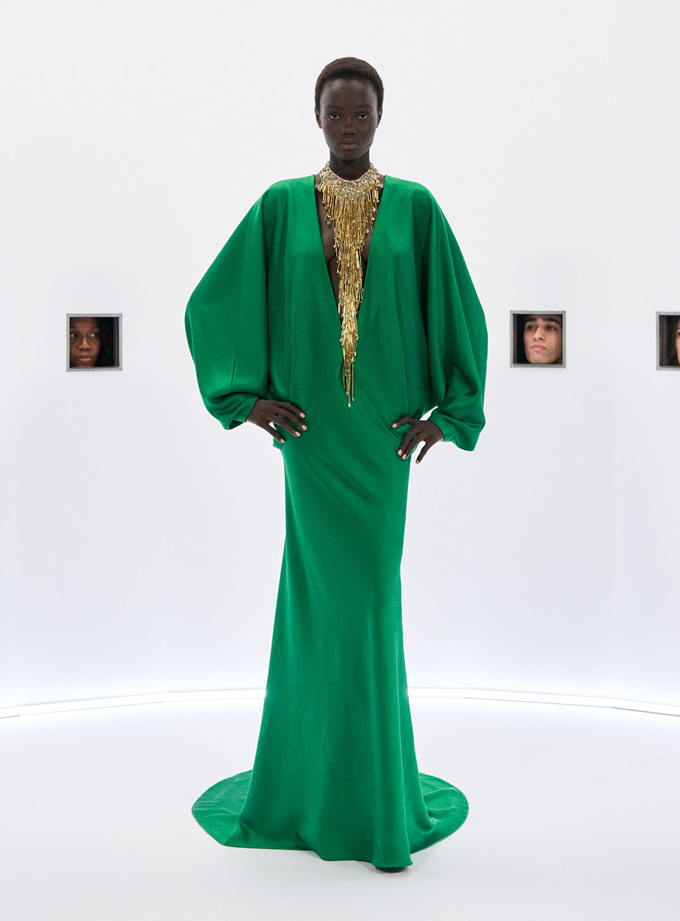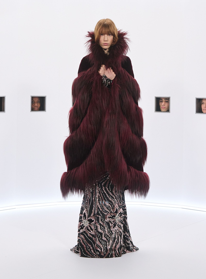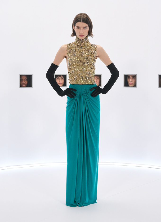 알레산드로 미켈레 고유의 맥시멀리즘 미학은 영화배우를 연상시키는 드레스로 단순히 캐릭터보다 무대 위의 존재감을 가진 올드 할리우드 시대의 화려한 의상을 소환했다.