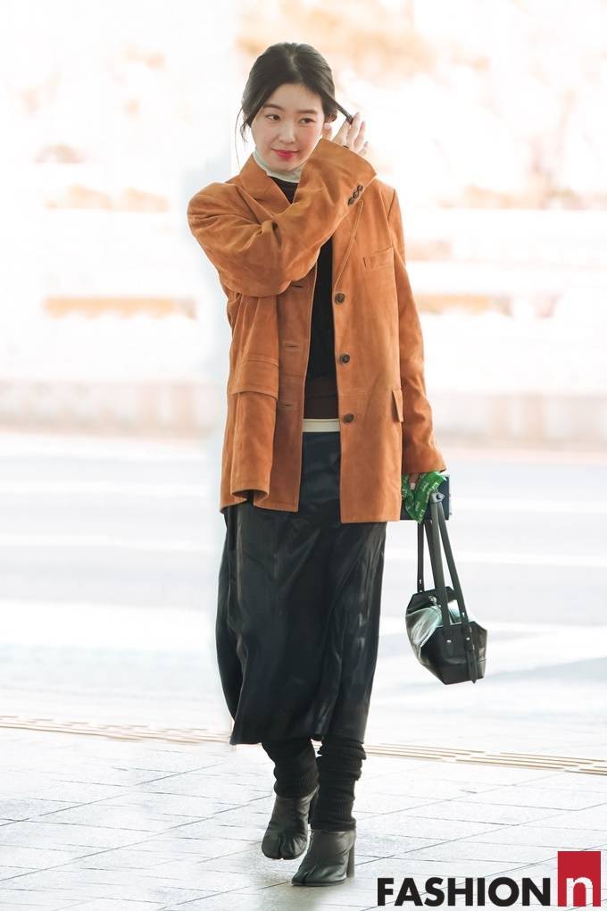 이날 아이린은 스웨이드 맥코트와 스커트를 매치한 보헤미안 감성의 스웨이트 투피스룩으로 성숙한 자태를 뽐냈다.
