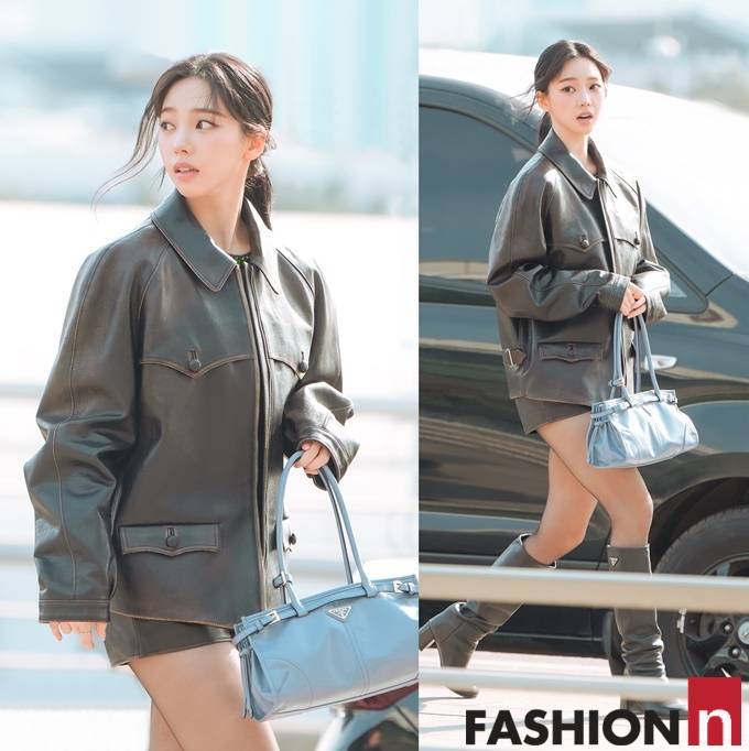 [패션엔 포토] 에스파 카리나, 가죽 재킷과 쇼츠! 취향저격 가죽 쇼츠룩 후쿠오카 출국