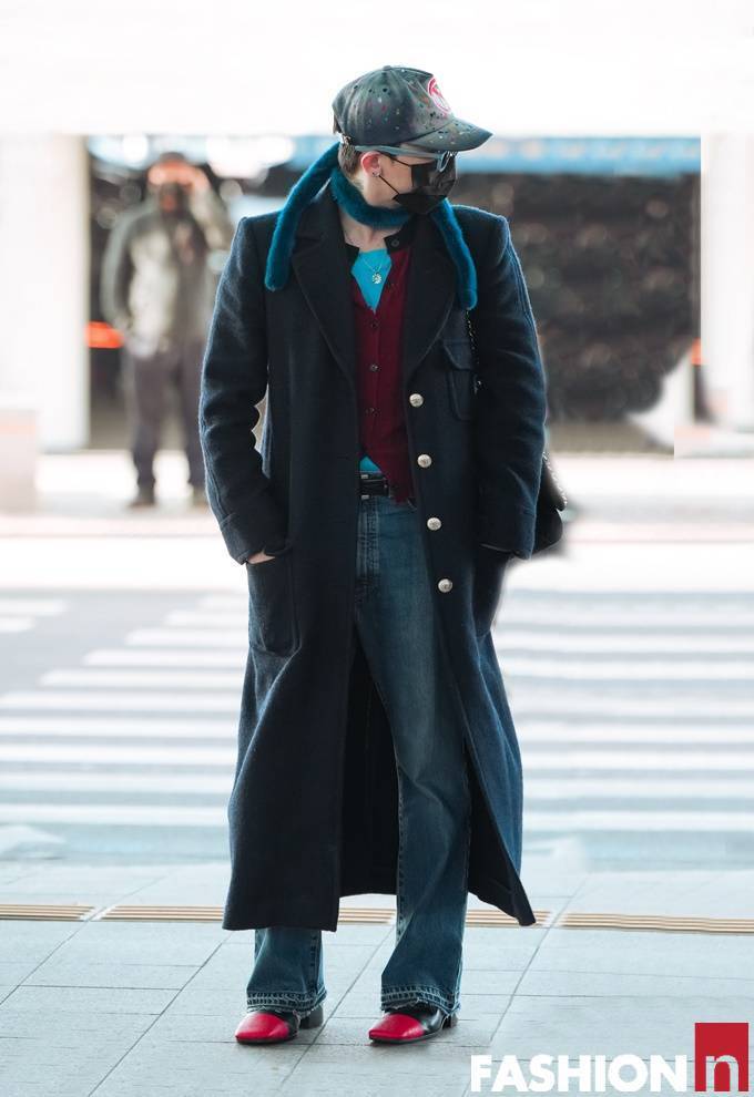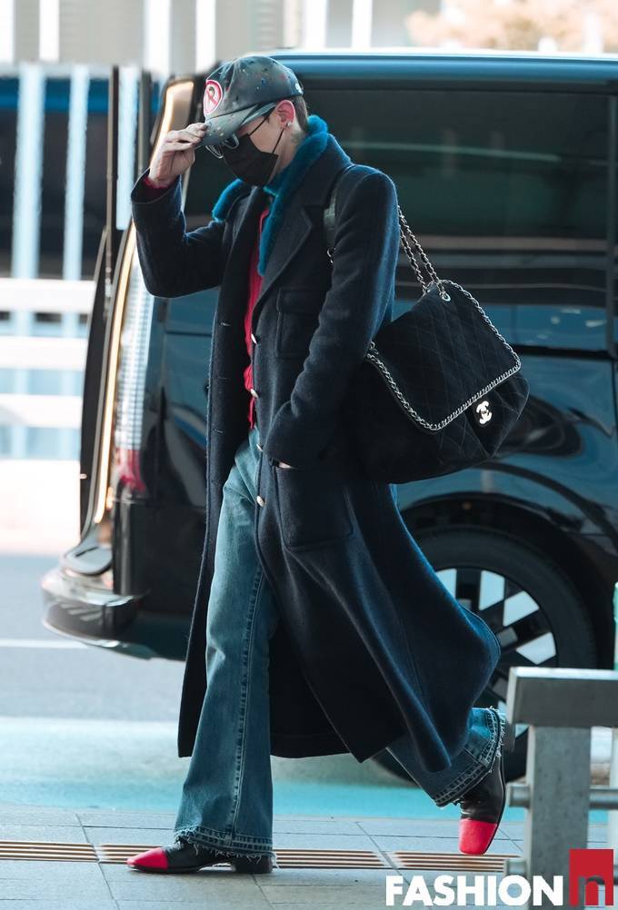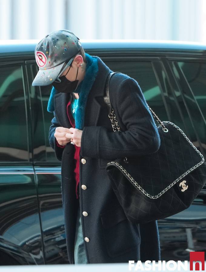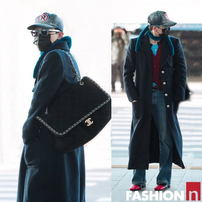 이날 지드래곤은 클래식한 맥시 코트와 모피 쁘띠 머플러, 마스크와 볼캡, 여기에 퀼팅 핸드백을 매치한으로 꽁꽁 감싼 공항패션으로 눈길을 사로잡았다.