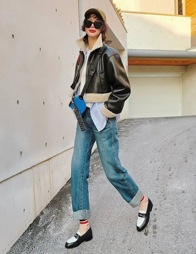 송경아는 묵직한 소재감의 레더 재킷이지만, 자연스럽게 떨어지는 핏과 살짝 여유 있는 실루엣 덕분에 부담 없은 데일리룩을 연출했다.